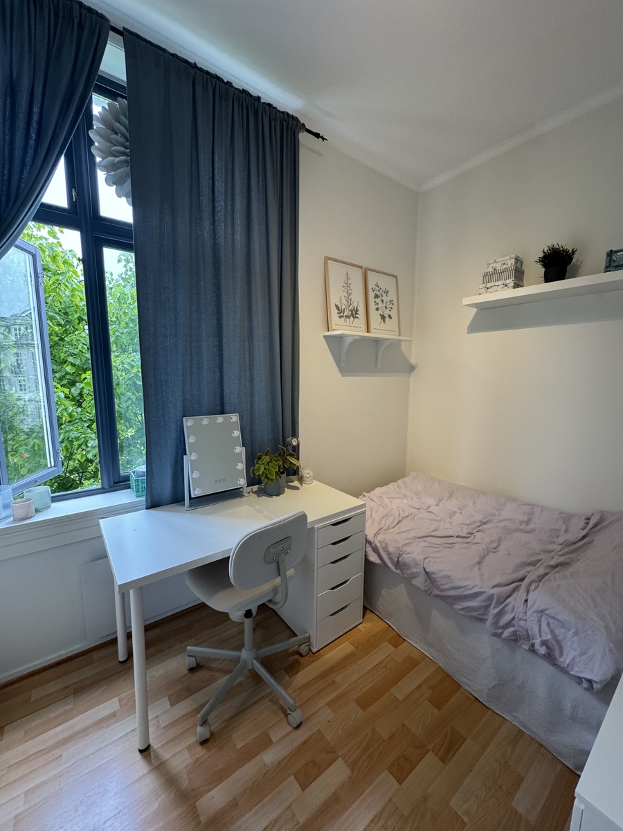 Leier ut et rom i kollektiv på Møhlenpris. Rommet er 8,4 kvm og har god plass til seng, pult og skap. God takhøyde og et stort vindu. Rommet leies ut med skap, seng, nattbord og pult m/ stol, gjøres etter avtale. Leiligheten ligger i 3. etasje og bygget har egen hage, ligger fint til med Nygårdsparken rett ved siden av. Leiligheten har et nytt, fresht kjøkken, og et romslig bad.