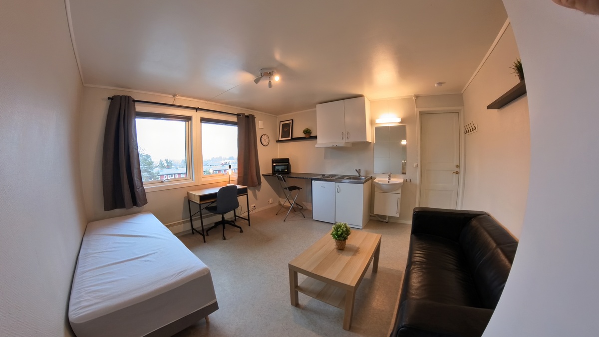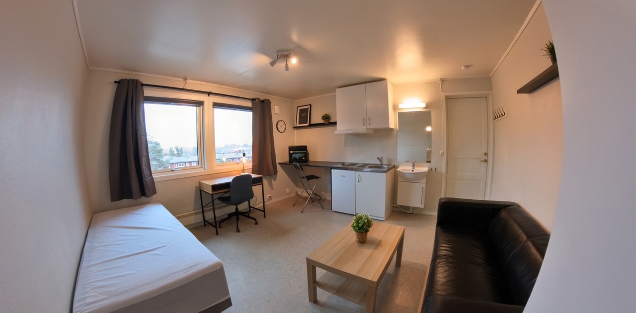 Hybelen er møblert med sofa, bord, skrivebord, kontorstol, seng og fastmontert garderobeskap.