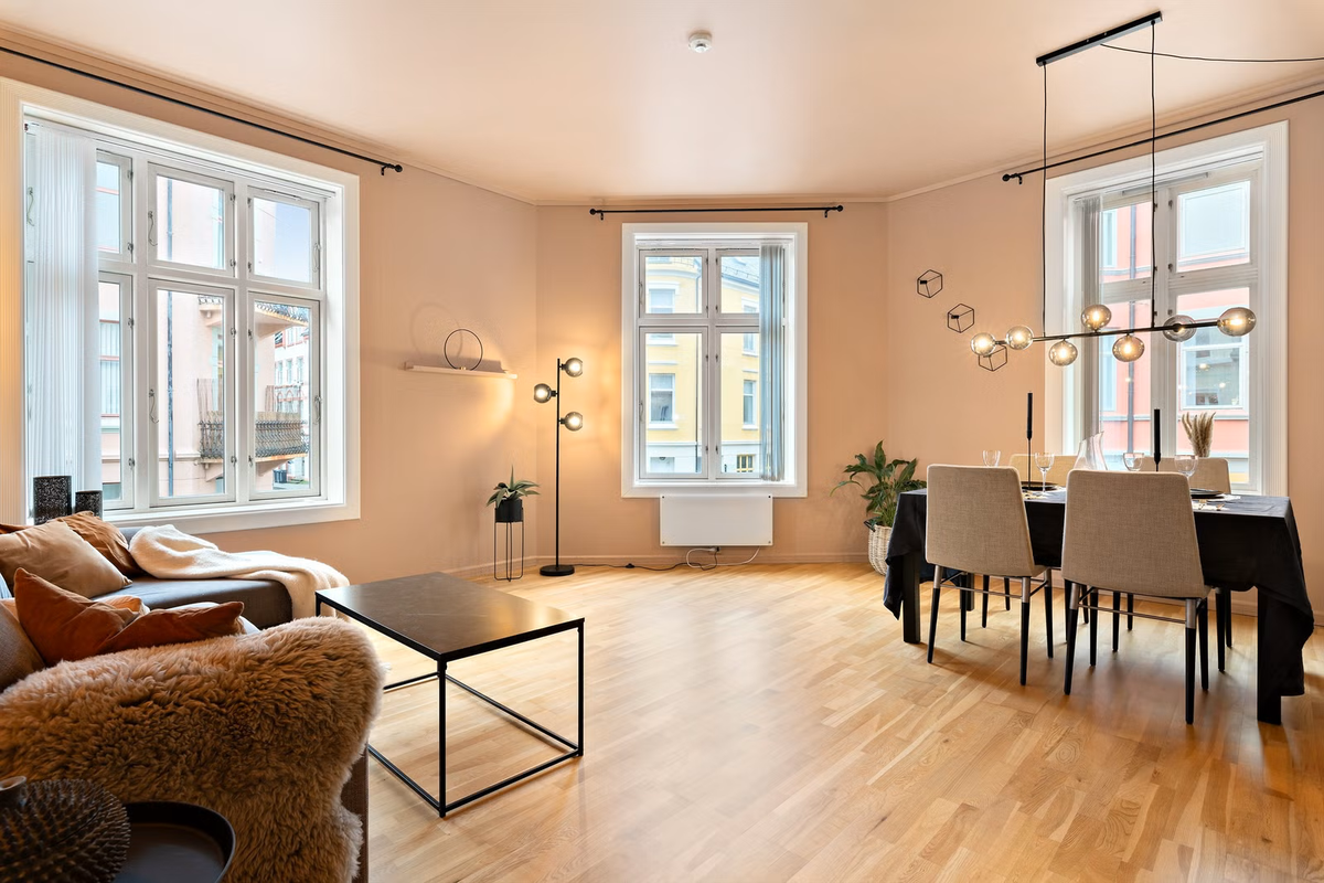 Leiligheten er møblert og innflyttingsklar, med stor takhøyde, og inneholder kjøkken/entré, stue, bad og soverom. Det er rikelig med vindusflater som strekker seg helt opp til taket.