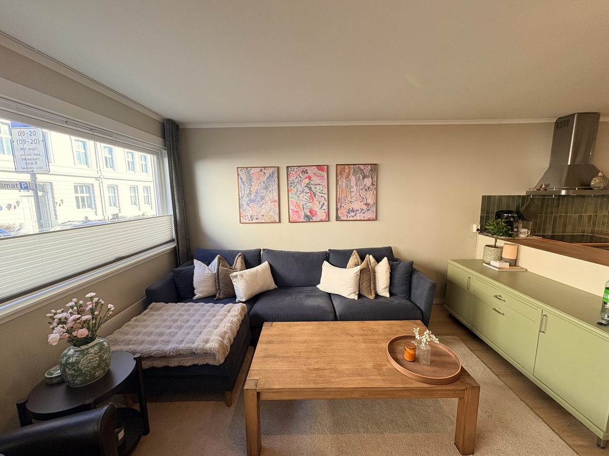 Store vindusflater gir godt med naturlig lys og bidrar til en luftig og hyggelig atmosfære i hele leiligheten.