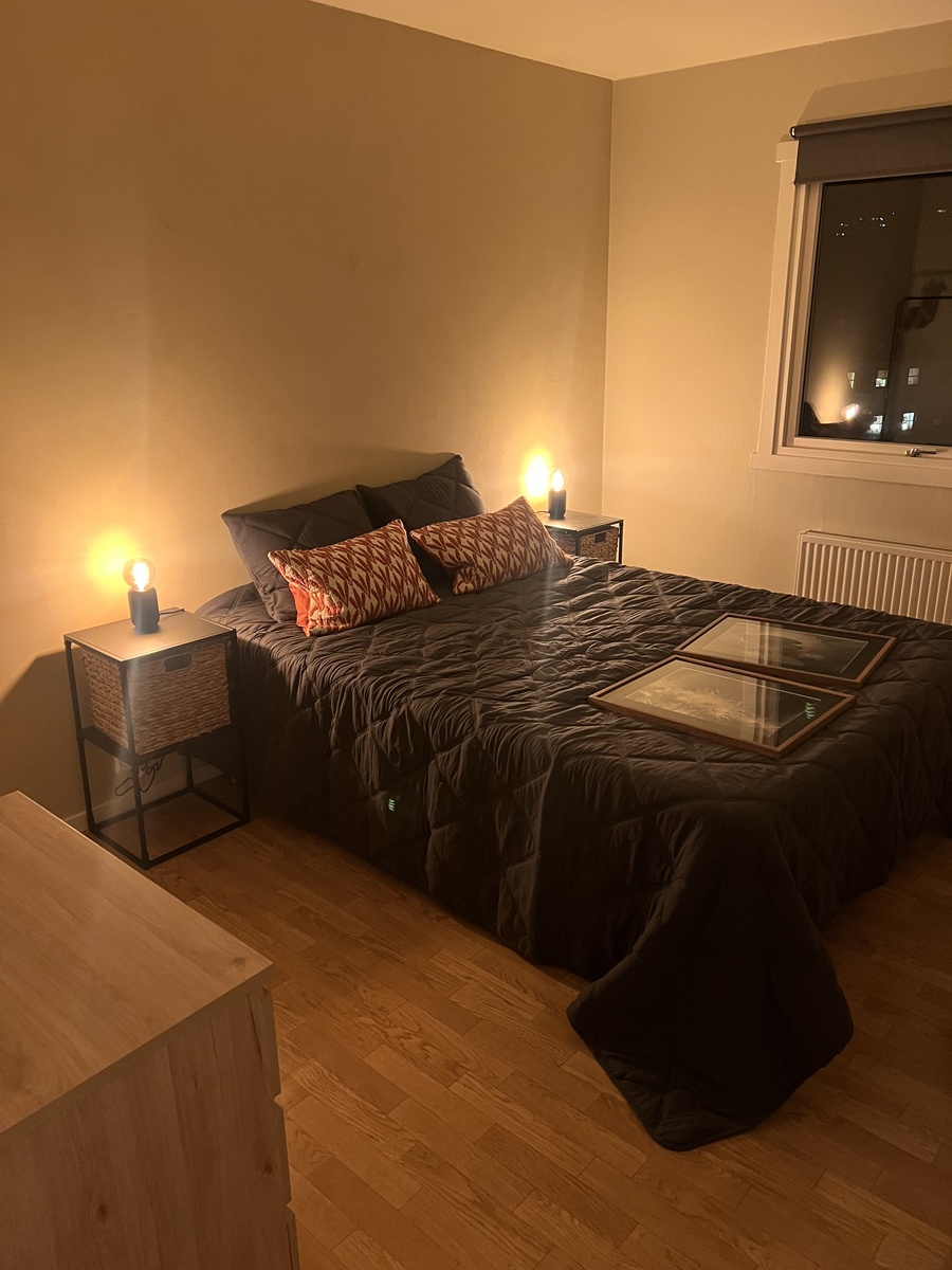 Rommet er ca 15m2, enkelt møblert med seng, nattbord, kommode og klesstativ. Leiligheten er på ca 85 m2, har stue, separat kjøkken, toalett, bad, vaskerom, kontor og balkong i tillegg til mitt rom og rommet som leies ut.