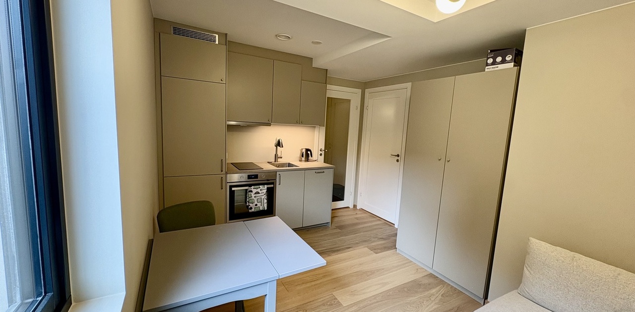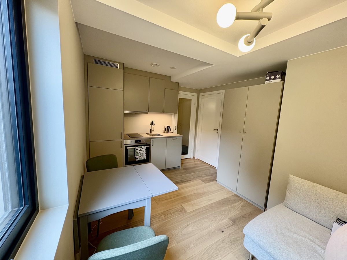 Hybelen inneholder oppholdsrom med lekkert innredet kjøkken med koketopp, stekeovn, kombikjøleskap og oppvaskmaskin, samt garderobeskap. Pent flislagt bad med varmekabler i gulv, vaskemaskin, toalett, dusj med glassvegger, servantskap og speil. Bod/alkove med glassdør bak kjøkken. Gang med varmekabler og klesstativ. Her kommer det også skyvedører med speil.