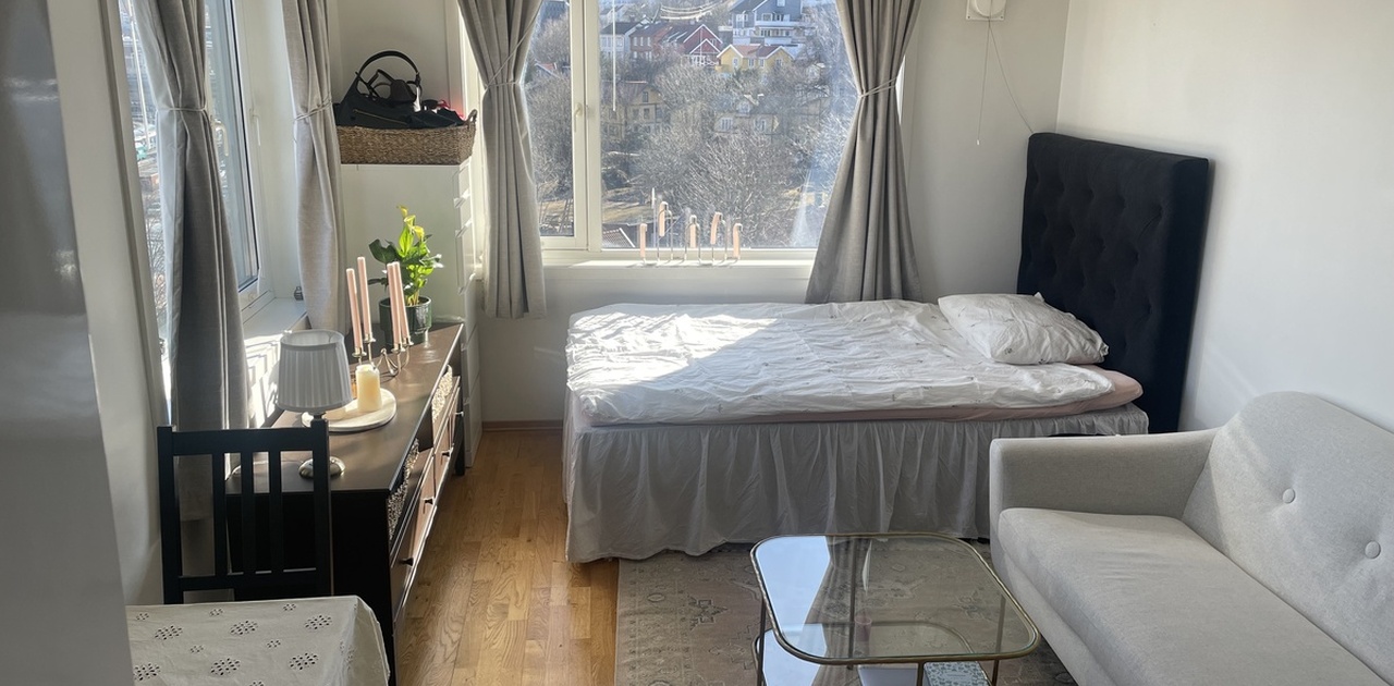 Høythengende og lys hybel med store vinduer som slipper inn rikelig med lys og luft. Siden den ligger i 6. etasje er det ingen gjenboere, noe som gir god utsikt og privatliv. Hybelen befinner seg i et pent og veldrevet borettslag.