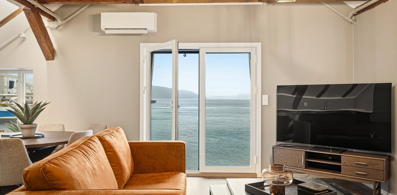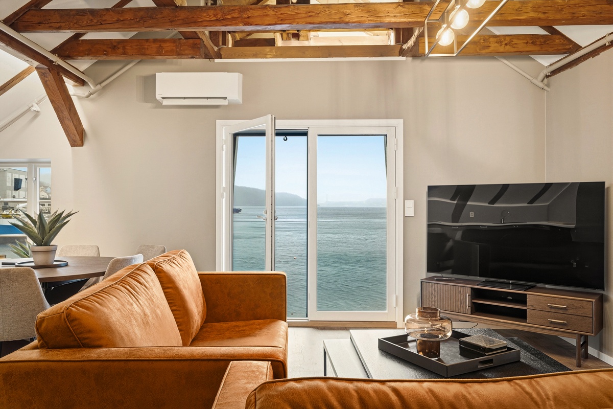 Lys og åpen stue med utsikt direkte mot sjøen