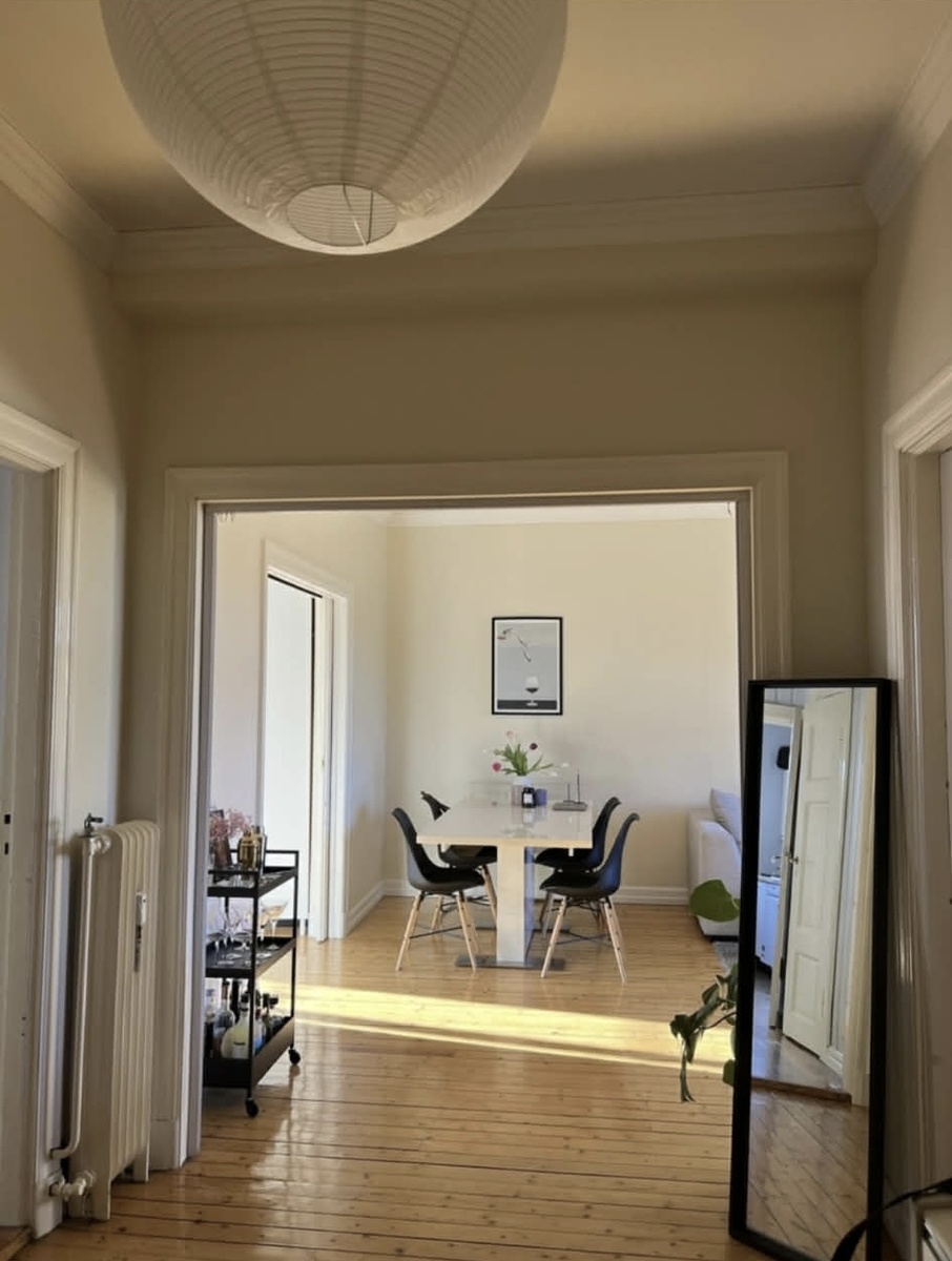 Leiligheten er luftig med stor takhøyde, og ligger sentralt. 10 minutter unna Majorstuen, 10 minutter å gå til Bislett. Vi har også busstoppet Vestre Aker Kirke rett utenfor døren. Rommet som leies ut er ca 8 kvadratmeter, umøblert og ligger adskilt fra stua, ved siden av kjøkken. Vi har i tillegg masse oppbevaringsplass på loft, en etasje over.