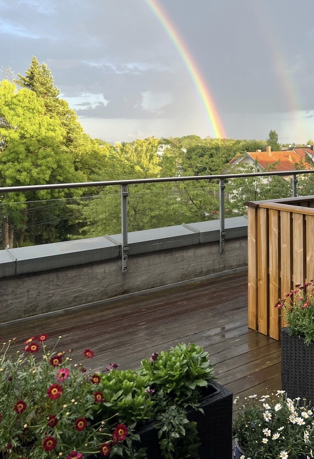 Leiligheten ligger høyt og fint, med trappefri adkomst fra inngangspartiet, men terrasen og vinduer ligger som en 2./3. etg over bakken.