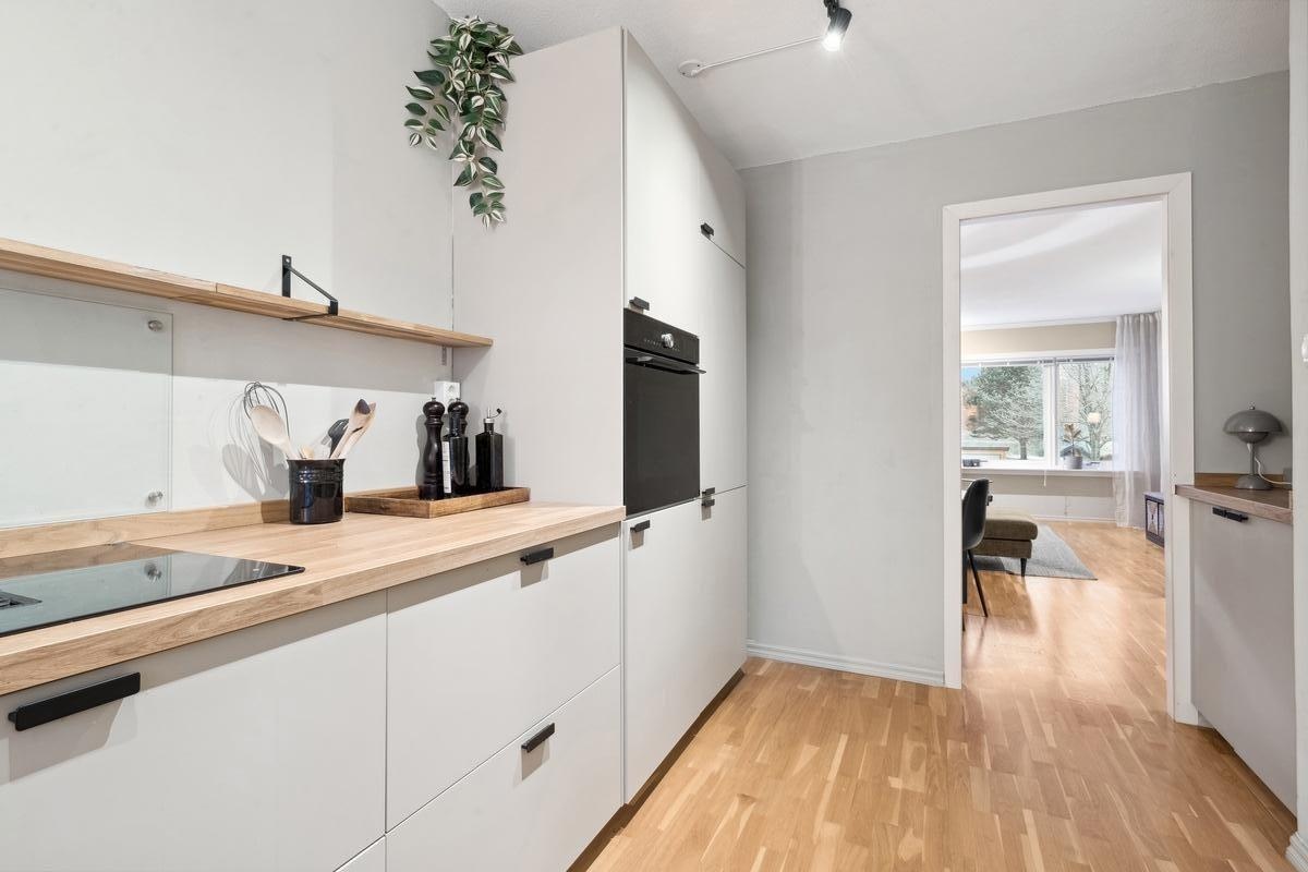 Kjøkkenet er funksjonelt og pent utformet, med gode arbeidsflater og rikelig oppbevaringsplass. Den åpne løsningen gir en naturlig flyt mellom kjøkken og oppholdsrom, og gjør leiligheten godt egnet både til hverdags og sosiale anledninger.