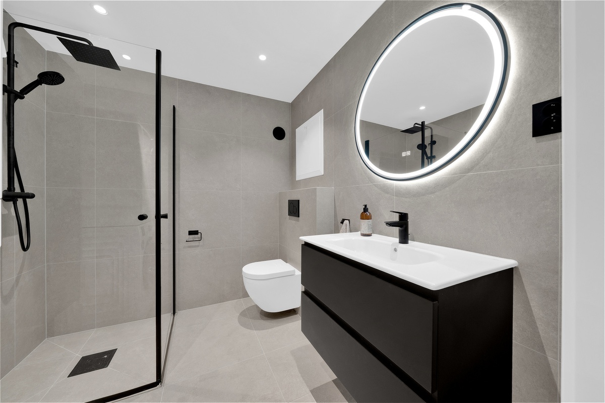 Badet er totalrenovert våren 2026 og har vaskemaskin og tørketrommel