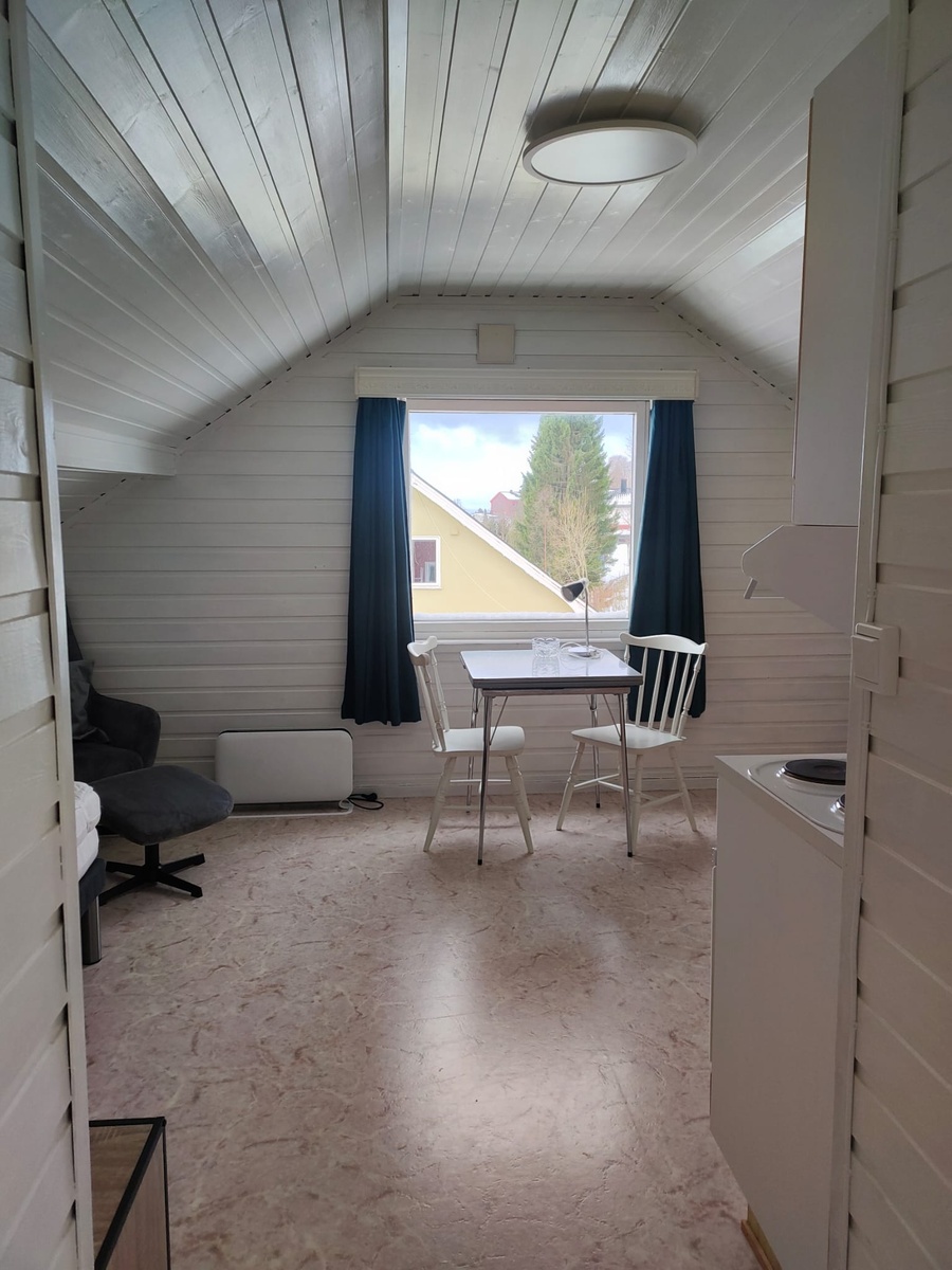 The room is fully furnished and has its own kitchen. Bathroom (with washing machine and dryer) and living room are shared. The house is close to town and several bus stops.