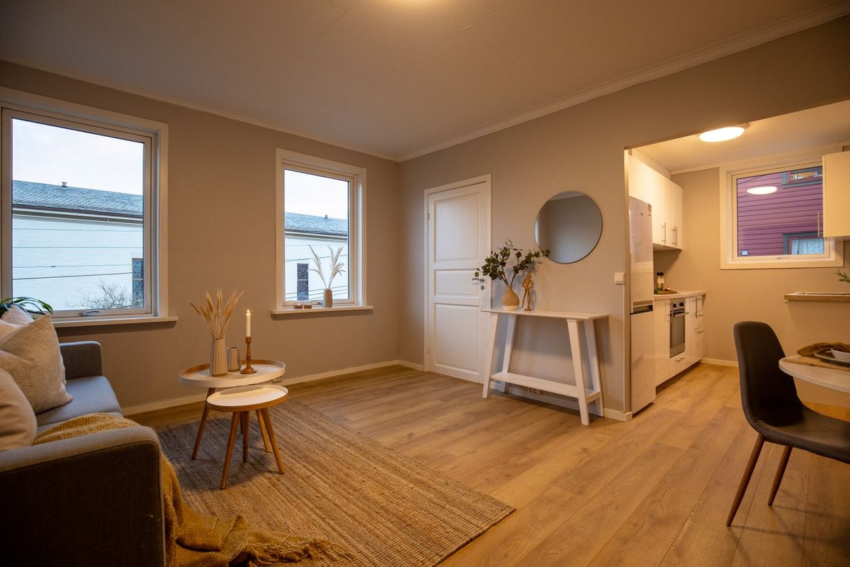 Den består av et stort kjøkken med åpen løsning til stue, to soverom med plass til dobbeltseng og ett med plass til en 120 seng. Alle soverommene har garderobeskap inkludert, og er romslige med store vinduer. I leiligheten er også et lekkert, bad med fliser og varmekabler. Stuen og kjøkkenet og alle tre soverommene har store vinduer med masse lysinnslipp. Veggene er malt lys beige og gulvet har ny parkett i eik. Leiligheten leies ut umøblert, men med hvitevarer inkludert. I kjelleren er det stor bodplass og vaskerom. I huset har vi installert fiber fra Bergen Fiber/Altibox. Eget abonnement kan tegnes til rabatterte priser.