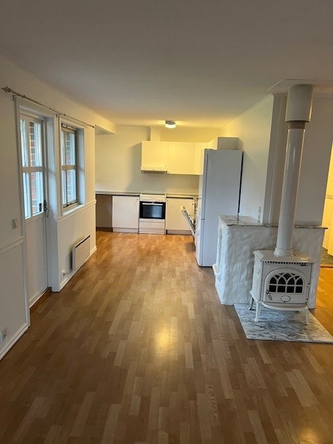 Flott leilighet med alle hvitevarer. Lys, trivelig leilighet. Leilighetsbygg med totalt 4 leiligheter. Peis i stuen. To soverom. Parkering på egen tomt.