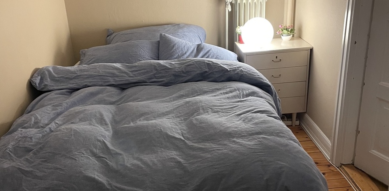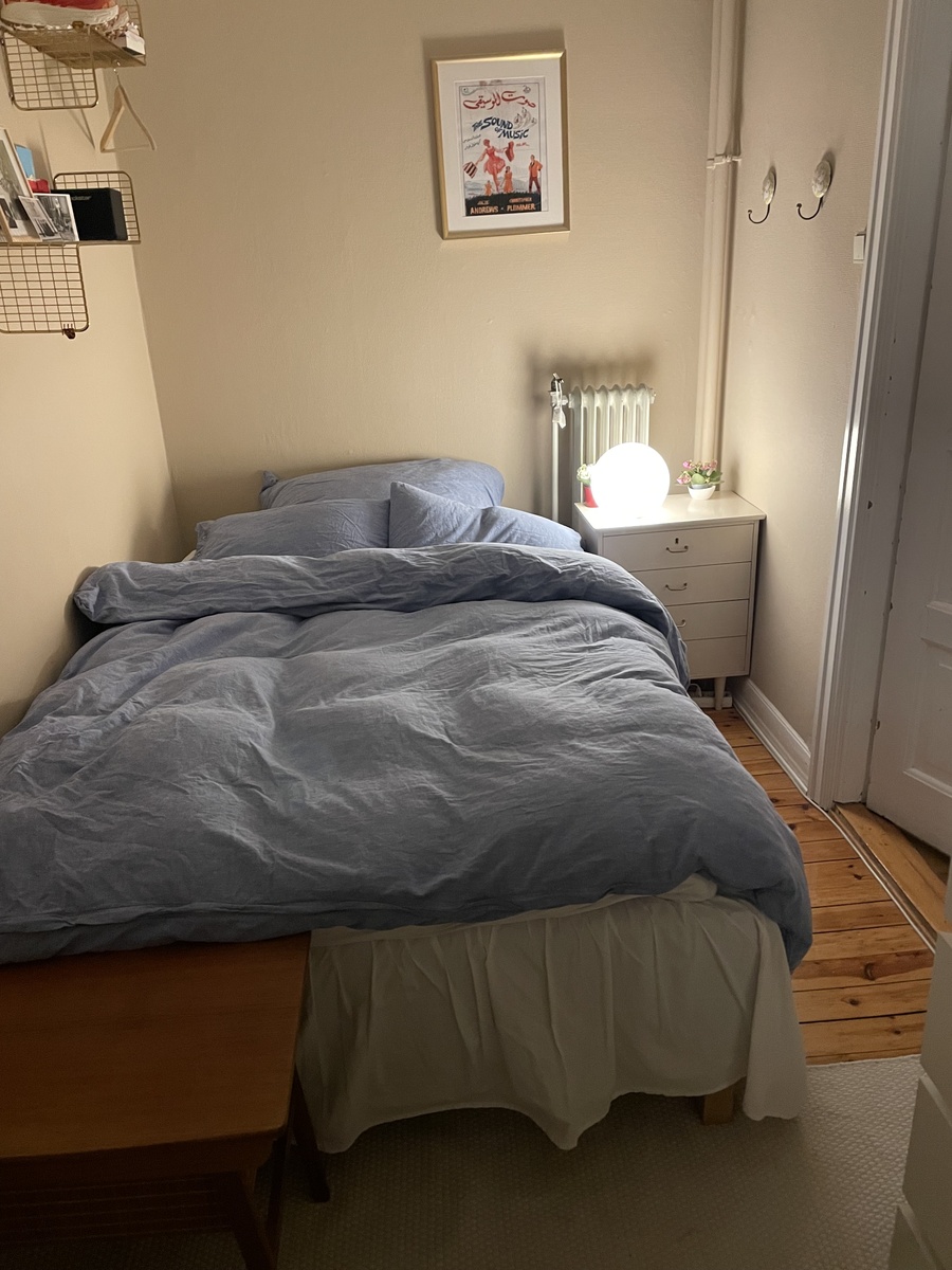 Rommet er lyst og koselig, og leies ut møblert med seng, kommode og nattbord. Det beste av alt er at rommet har egen balkong, perfekt for morgenkaffe eller sommerkvelder!