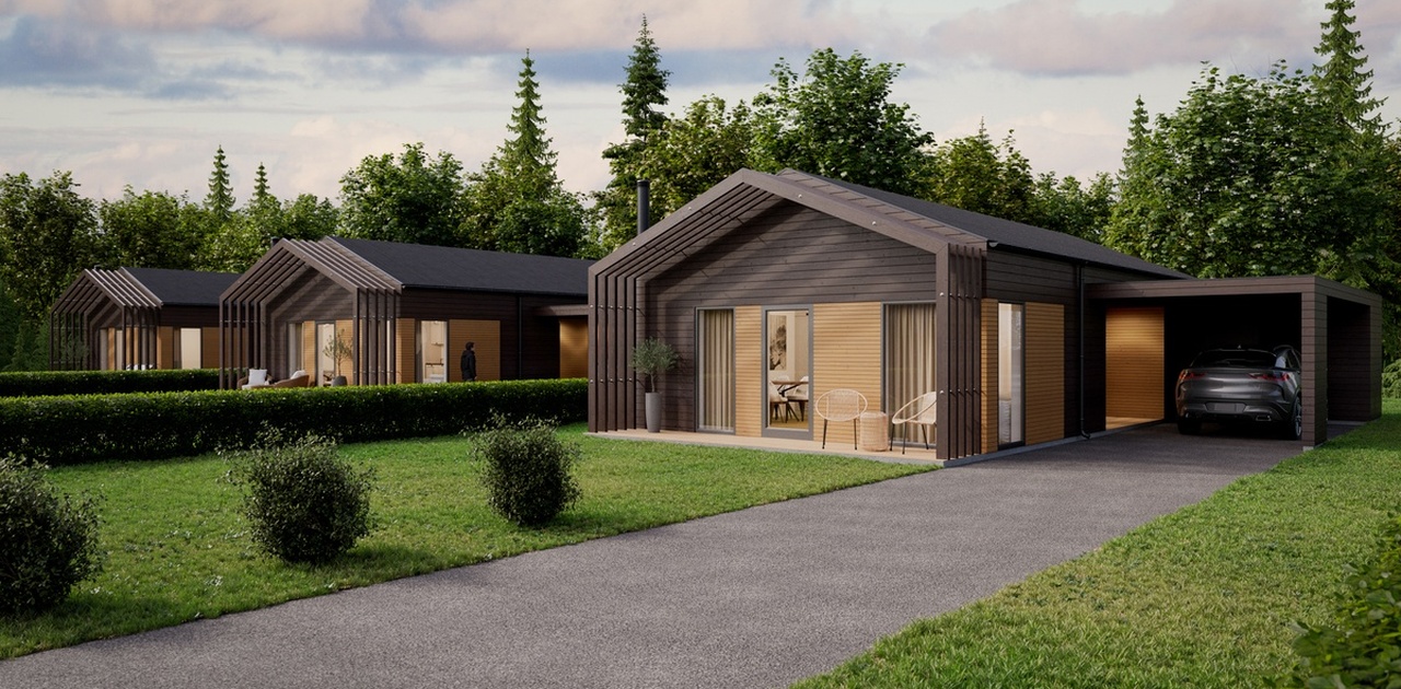 The houses are unfurnished, but white goods are included. Features include electric vehicle charger, fireplace, outdoor storage shed, and carport with parking. Available for rent from summer 2026. Rental price applies per house.
