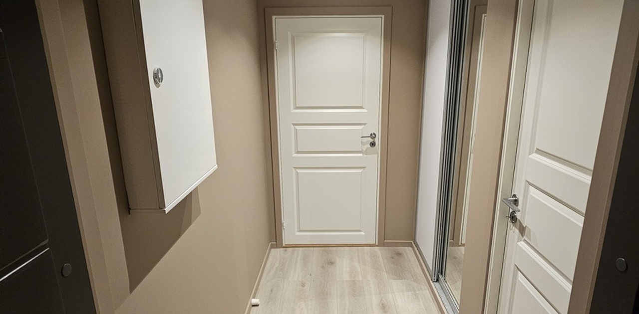 Lys og praktisk gang med innebygd klesskap og skostativ bak skyvedører