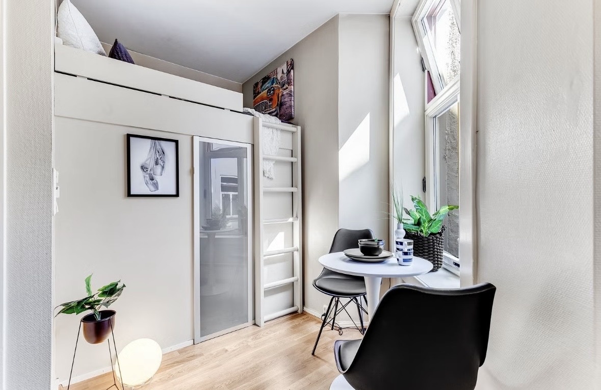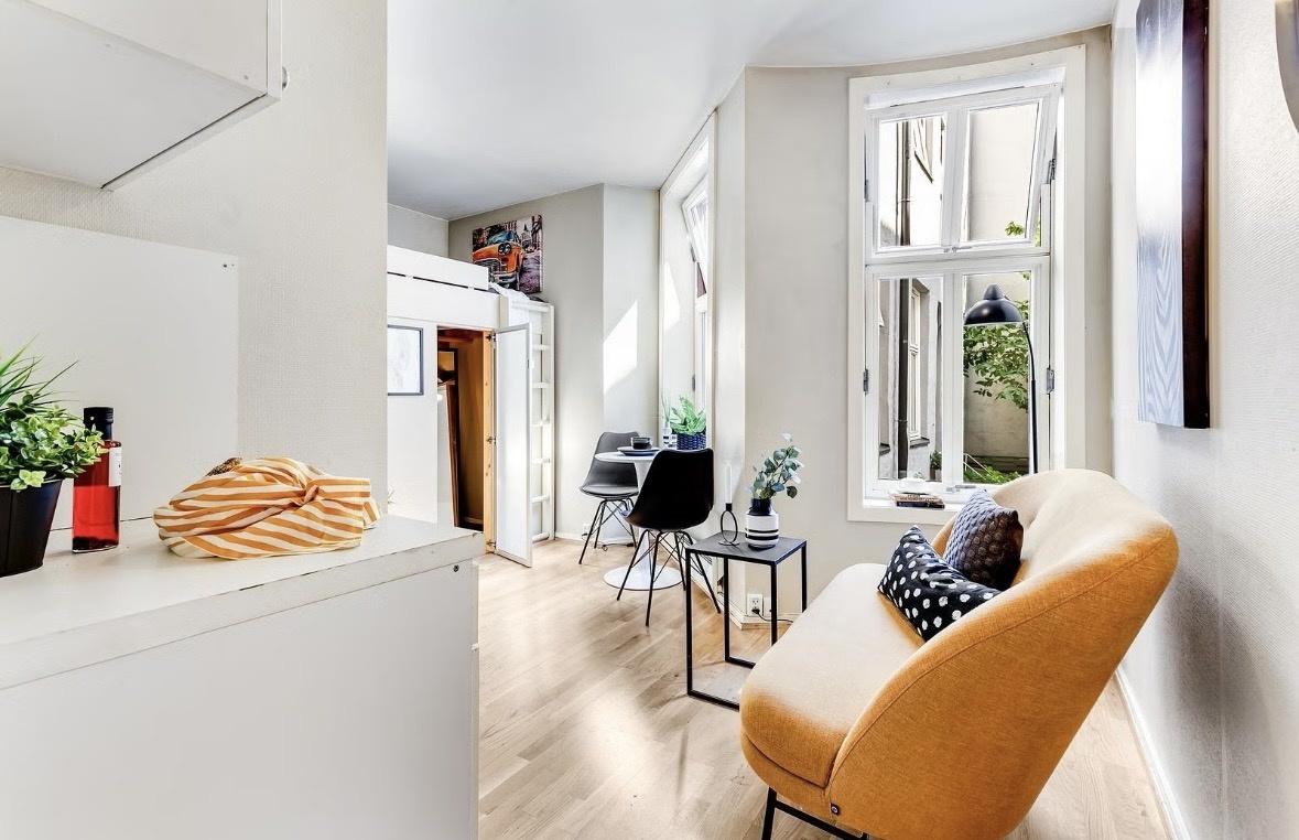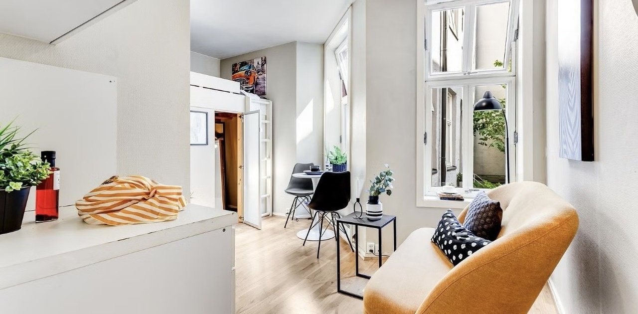 Hyblen er fullt møblert med mine egne møbler, og har en smart og arealeffektiv planløsning. Den har en hems med soveplass, som gir en egen og skjermet sone for søvn, samt en walk-in closet med god lagringsplass. Dette gir en romslig og praktisk følelse til tross for størrelsen.