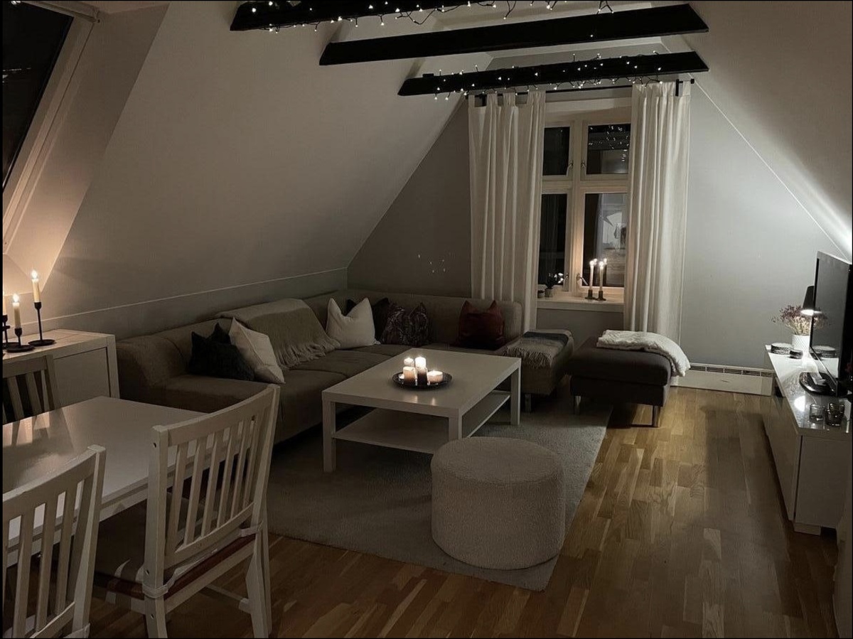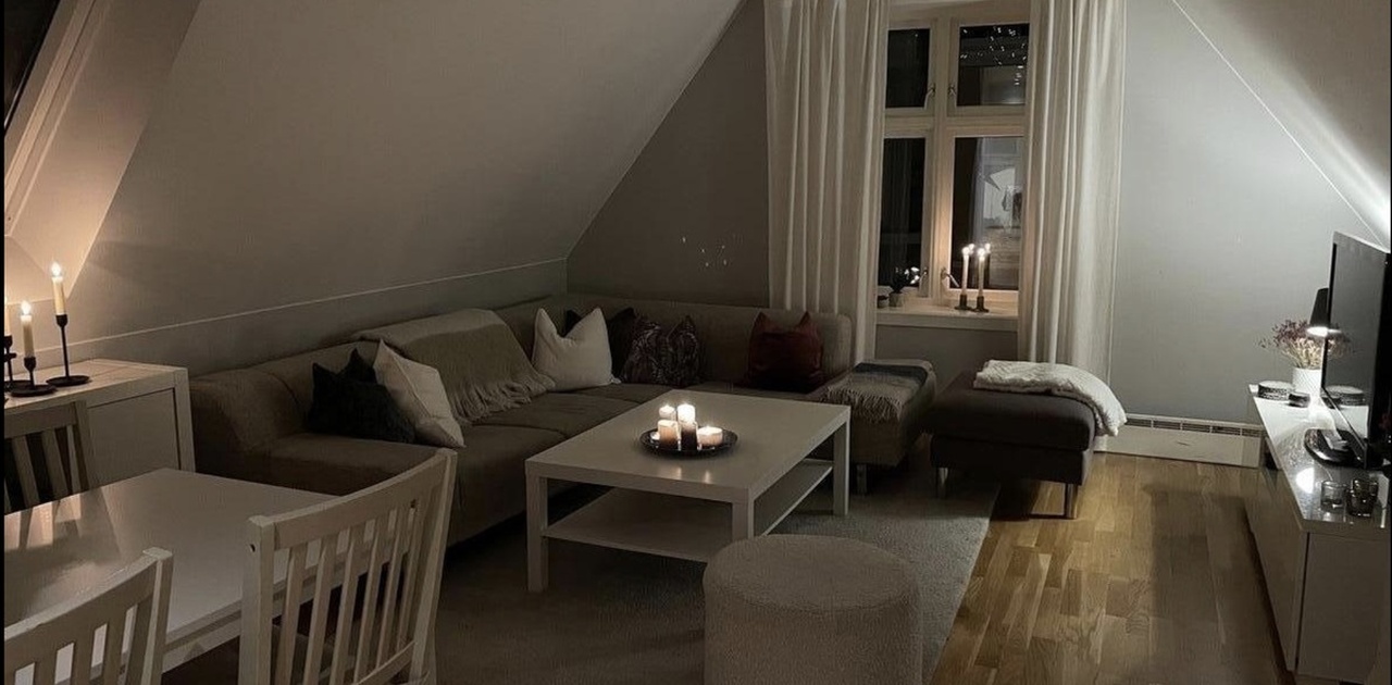 Rommet er møblert med 120 cm seng, skap og kommode. Det er også panelovn på rommet, og egen bod rett utenfor til ekstra oppbevaring. Leiligheten har en koselig stue og kjøkken som blir brukt masse sammen. På kjøkkenet har alle sitt eget kjøleskap og egen skuff.