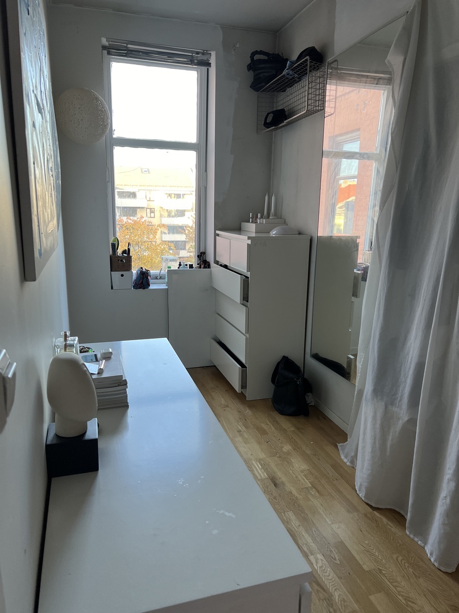 Det ledige rommet er på 11 kvadrat med plass til stor seng og vindu ut mot bakgården. Det står umøblert, men det er mulighet for å ta over en standard 120-seng uten overmadrass og en kommode som står igjen fra forrige leietaker, begge fra IKEA. Vi som bor her har malt opp våre egne rom selv, og hvis du har lyst til å gjøre det samme så dekker utleier kostnadene for maling og utstyr! Leieprisen er på 8500kr,- i mnd og depositum er på 25 500kr,-. Kontrakt tegnes med utleierfirma via hybel.no. Internett (stabilt fibernett) på 107kr,- og strøm kommer utenom leien. Strømmen varierer med forbruk og har ligget på ca. 500 kr,- i vinter, men vil nok bli betydelig billigere til våren. Rommet er klart for overtakelse så fort du er.