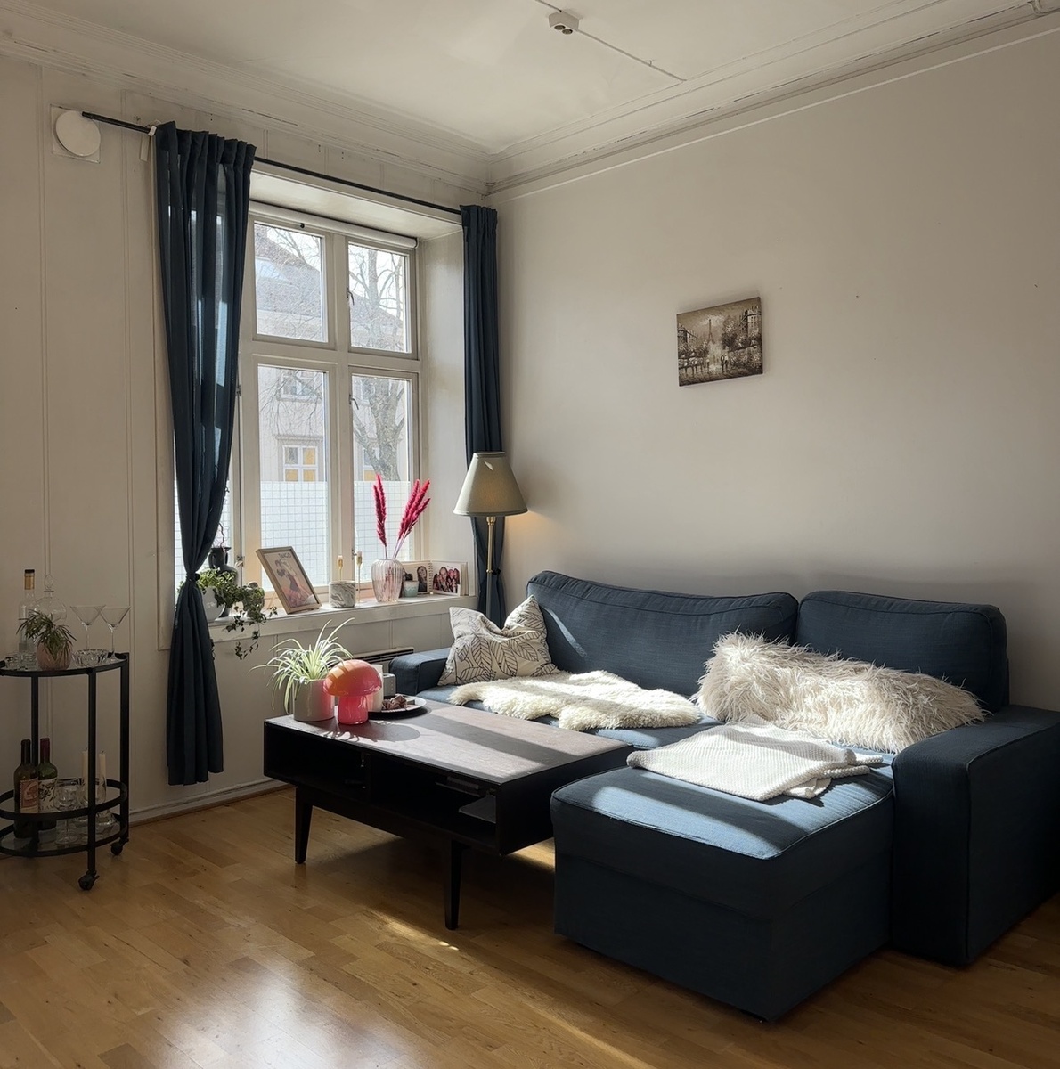 Toaletter og bad er allerede møblert med hvitevarer, det samme er kjøkkenet som også kommer med et spisebord og fire stoler. Soverommet er i utgangspunktet kun møblert med klesskap. Likevel er det slik at ettersom jeg skal på utveksling i et halvt år for å så komme tilbake, ville det vært fordelaktig om du ønsker å beholde sofa, seng, bord og tv-benk (alle vises på bildene av soverommet). Du kan overta dette gratis med forbehold om at det forblir der til slutten av leieperioden.