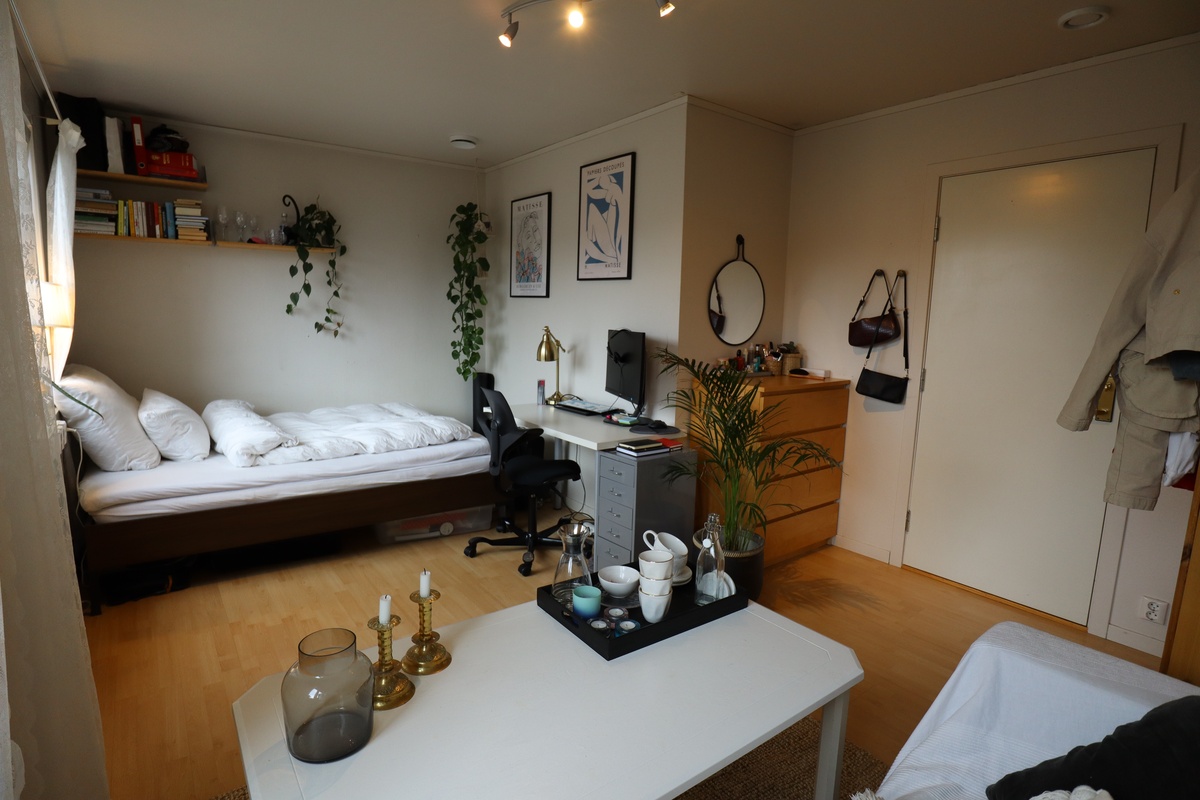 Det leies ut møblert med seng og garderobeskap og en liten skrivepult.
