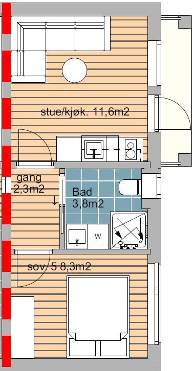 - Kombinert stue/kjøkken med integrerte hvitevarer (inkl. oppvaskmaskin)