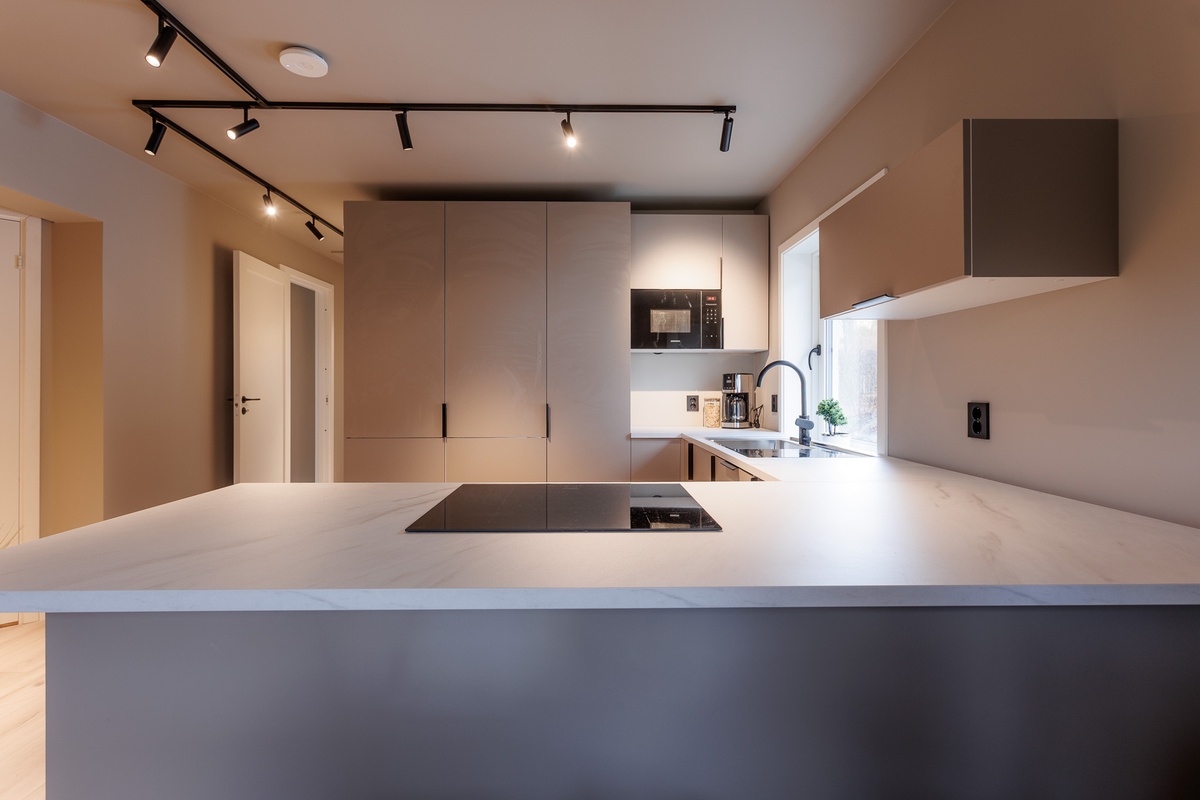 Kjøkkenet er nytt fra HTH og leveres med Siemens hvitevarer. Stuen er møblert og inkluderer 65” TV. Fiber på 500/500 Mbps er inkludert, og nettet er godt fordelt i hele boligen via takmonterte TP-Link-aksesspunkter. Dette gir stabil og rask dekning til studier, hjemmearbeid, streaming og gaming.