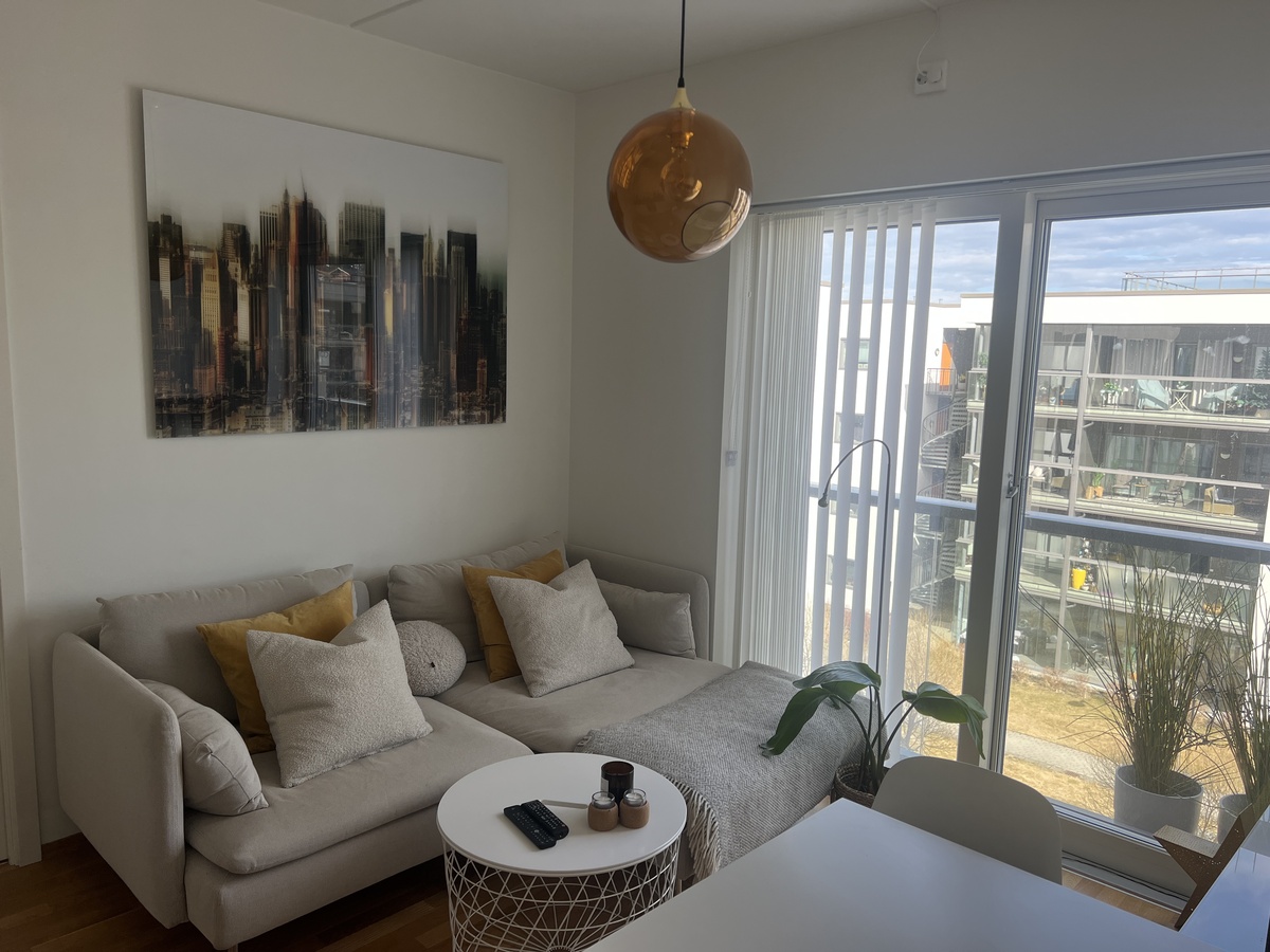 Leiligheten er på 37 m² og har en funksjonell og arealeffektiv planløsning. Den består av stue og kjøkken i åpen løsning, separat soverom, bad og en sovealkove. Leies ut ferdig møblert og inkluderer nødvendige hvitevarer. Den franske balkongen gir godt med naturlig lys og skaper en åpen romfølelse.