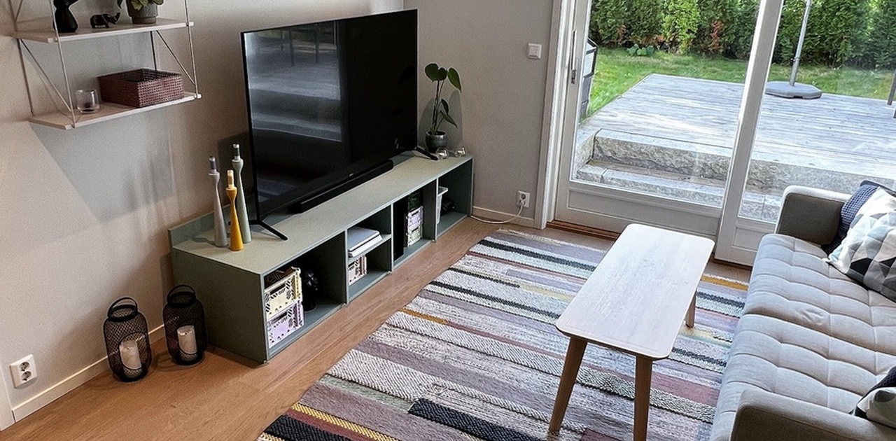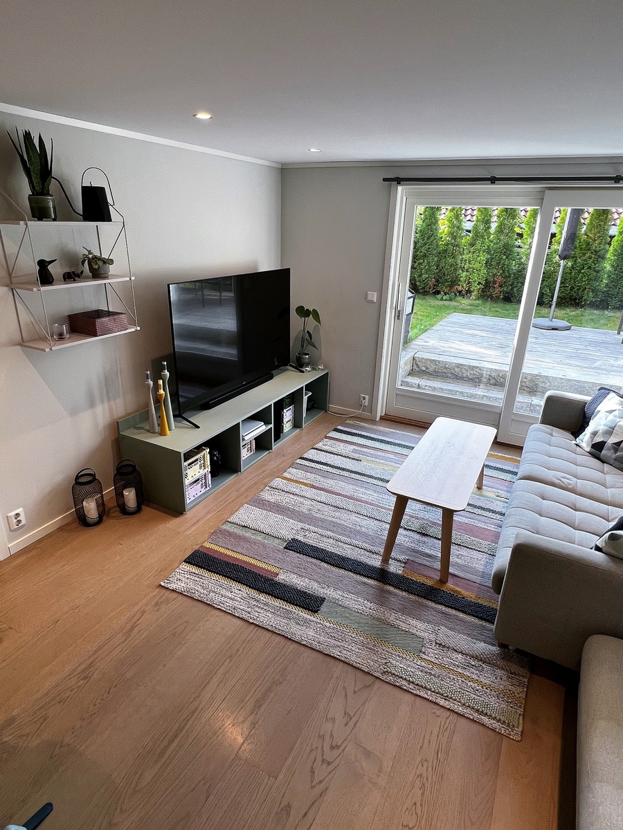 Lys og åpen del av enebolig som inneholder 2 soverom (ett med walk-in closet), stue med åpen kjøkkenløsning, gang, bad og utgang til del av felles hage, og passer ypperlig for en liten barnefamilie.