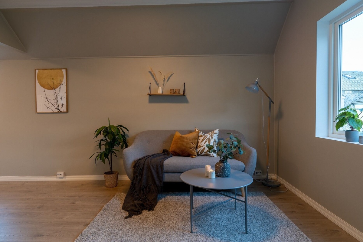 Alle rom er malt i lyse og fine farger, og det er parkett på gulvet. Leiligheten holder god standard, delvis renovert i 2020 med bland annet nytt bad og kjøkken. Det er et eget inngangsparti, og i stuen kan man fint møblere med sofagruppe og spisebord. Kjøkkenet er godt utstyrt og har hvite fronter. Soverommene har plass til seng og garderobeskap der det ene er litt større. Badet er romslig og er delikat flislagt og har varmekabler og vaskemaskin. Det er store vinduer på alle rom med godt lysinnslipp. Kjøkkenet har kombiskap og oppvaskmaskin, og alle hvitevarer er inkludert i husleien. Fiber fra Bergen Fiber er installert, rabatterte abonnement kan tegnes av leietaker.