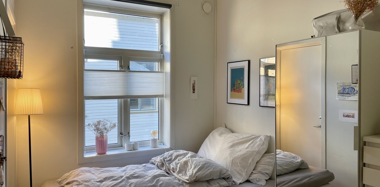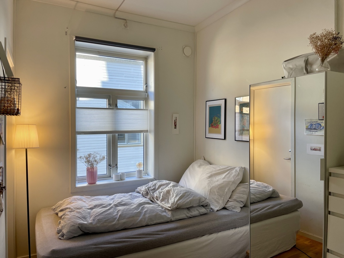 Vi leier ut et koselig rom med høyt under taket, god skapplass (høyt skap), kommode og seng (med oppbevaringsplass under). Det finnes også en pult i boden dersom du vil flytte den inn. Bod til oppbevaring følger med.