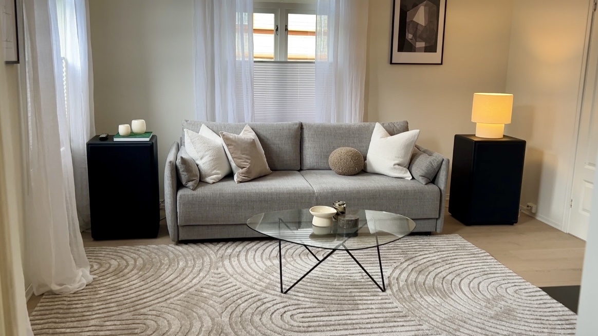 - Stue med 3 seter sovesofa, sofabord, gulvteppe og vegghengt TV