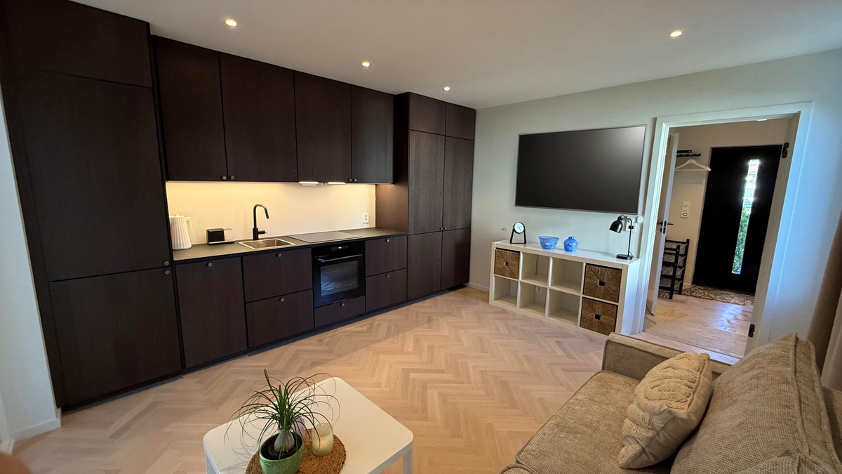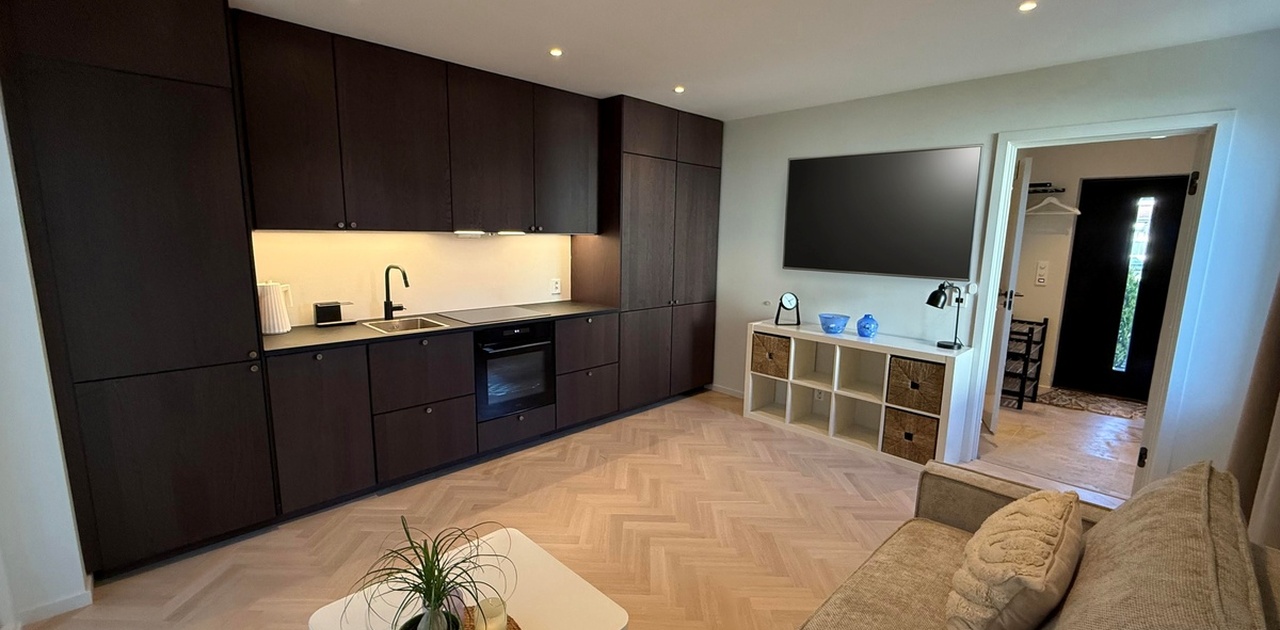 Kjøkkenet har integrerte hvitevarer med kjøleskap og fryser, oppvaskmaskin, platetopp, komfyr og ventilator. Kjøkken og alle hvitevarer er nye.