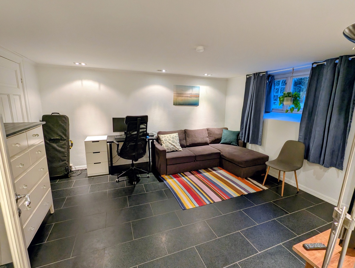 Koselig delvis møblert kjellerleilighet med egen inngang. Du kommer inn i en hyggelig gang og kjøkken, deretter inngang til lys, romslig og fin kombinert stue/soverom.