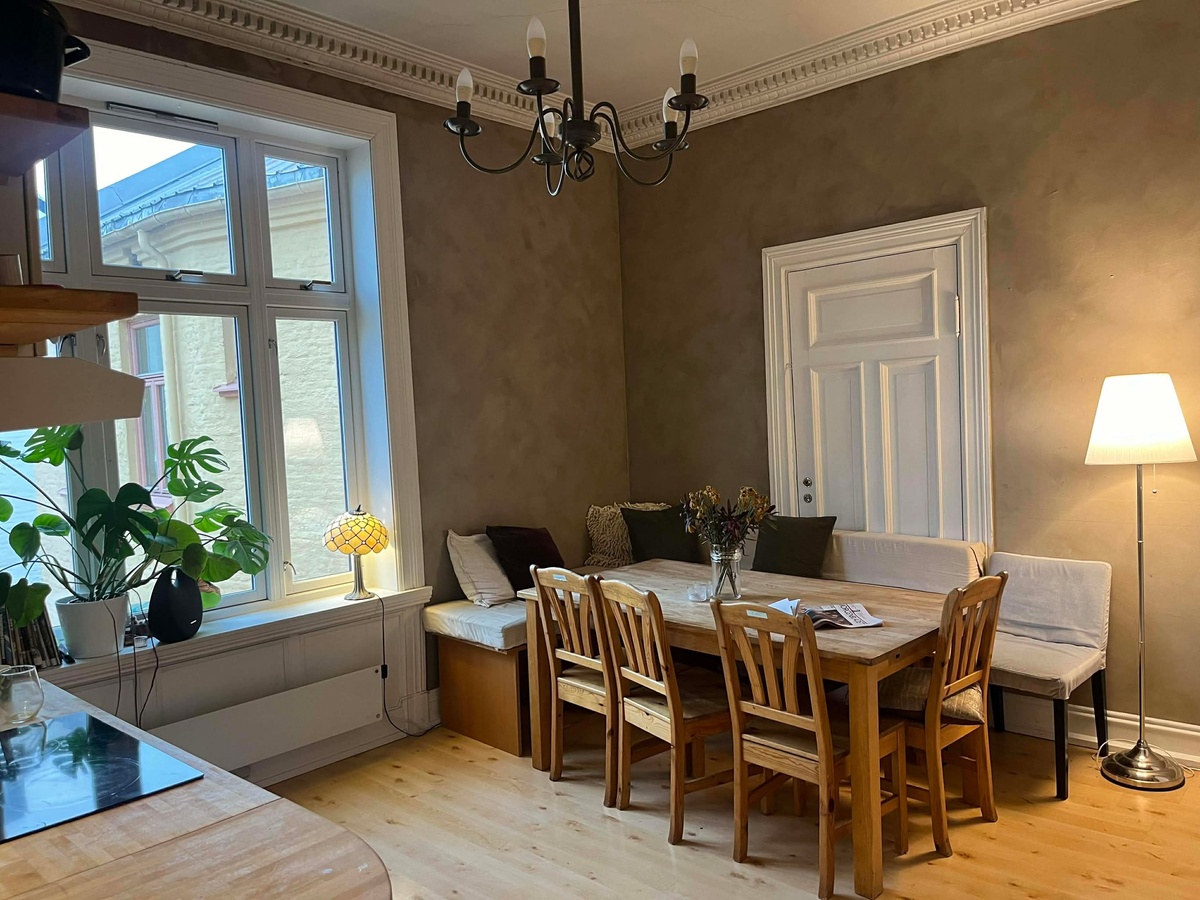 The apartment is located on the 4th floor with views directly over Vestkanttorget – a charming square known for its popular flea market every Saturday. Both bedrooms are bright and sun-filled, catching both morning and evening sun. The rooms feature ceilings over 3 metres high, large windows, and classic stucco details that give them a real sense of character.