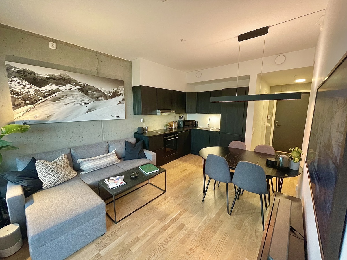 Leiligheten har et fullt utstyrt kjøkken med induksjonstopp, oppvaskmaskin, airfryer og mikrobølgeovn. Badet har vask-/tørk-kombinasjon samt elektrisk tørkestativ med varme. I tillegg har du tilgang til to felles takterrasser med sittegrupper, en liten lekeplass, basketballkurv, slackline og et enkelt utendørs treningsområde. Leiligheten er godt ventilert med ventilasjonsanlegg. Det er også mulig å avtale utlån av vaskerobot, så lenge leietaker forplikter seg til å utføre enkelt vedlikehold.