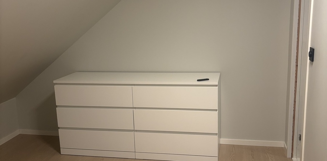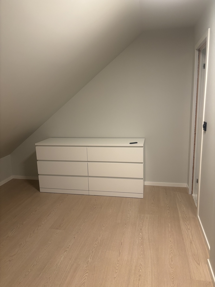 Rommet er på 7kvm. Det er skrått tak, så gulvarealet er større, som er en fordel for oppbevaring. Rommet leies ut delvis møblert med en kommode med 6 skuffer. Ellers er alt av utgifter dekket under månedsleie, så det er ingen uforutsette utgifter.