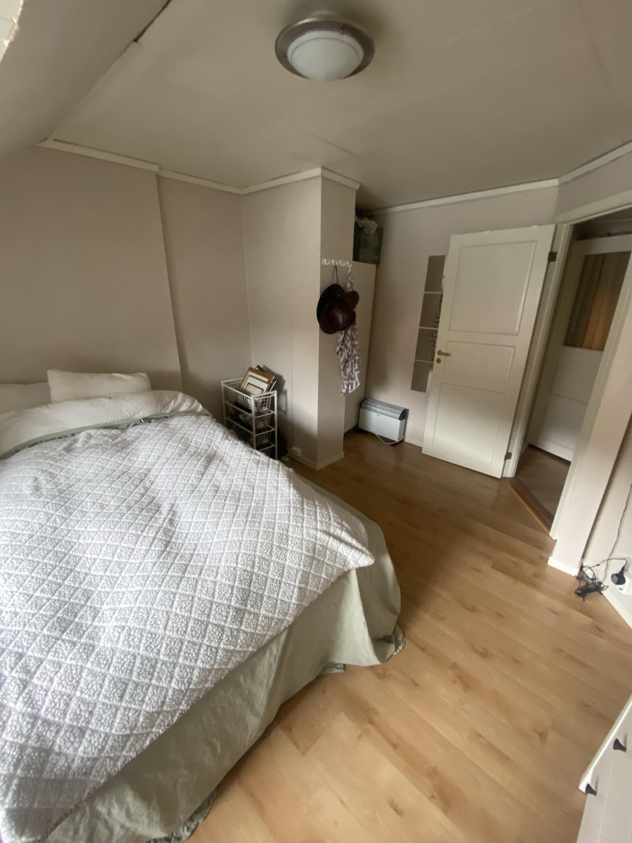 Det ledige rommet er ca. 13 kvm stort, men vi har ikkje eksakte mål. Det er eit fint og stort rom med utsikt mot Ulriken. Leilegheita er over to etasjer, så alle soveromma er plassert i øverste etasje. Rommet er umøblert med unntak av eit skap. I øverste etasje er det også ei lita bod der det er plass til kofferter og liknande.