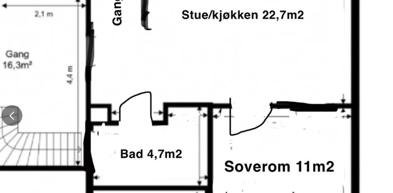 Ca 50kvm, egen inngang, stue/kjøkken, bad, et soverom og bod.