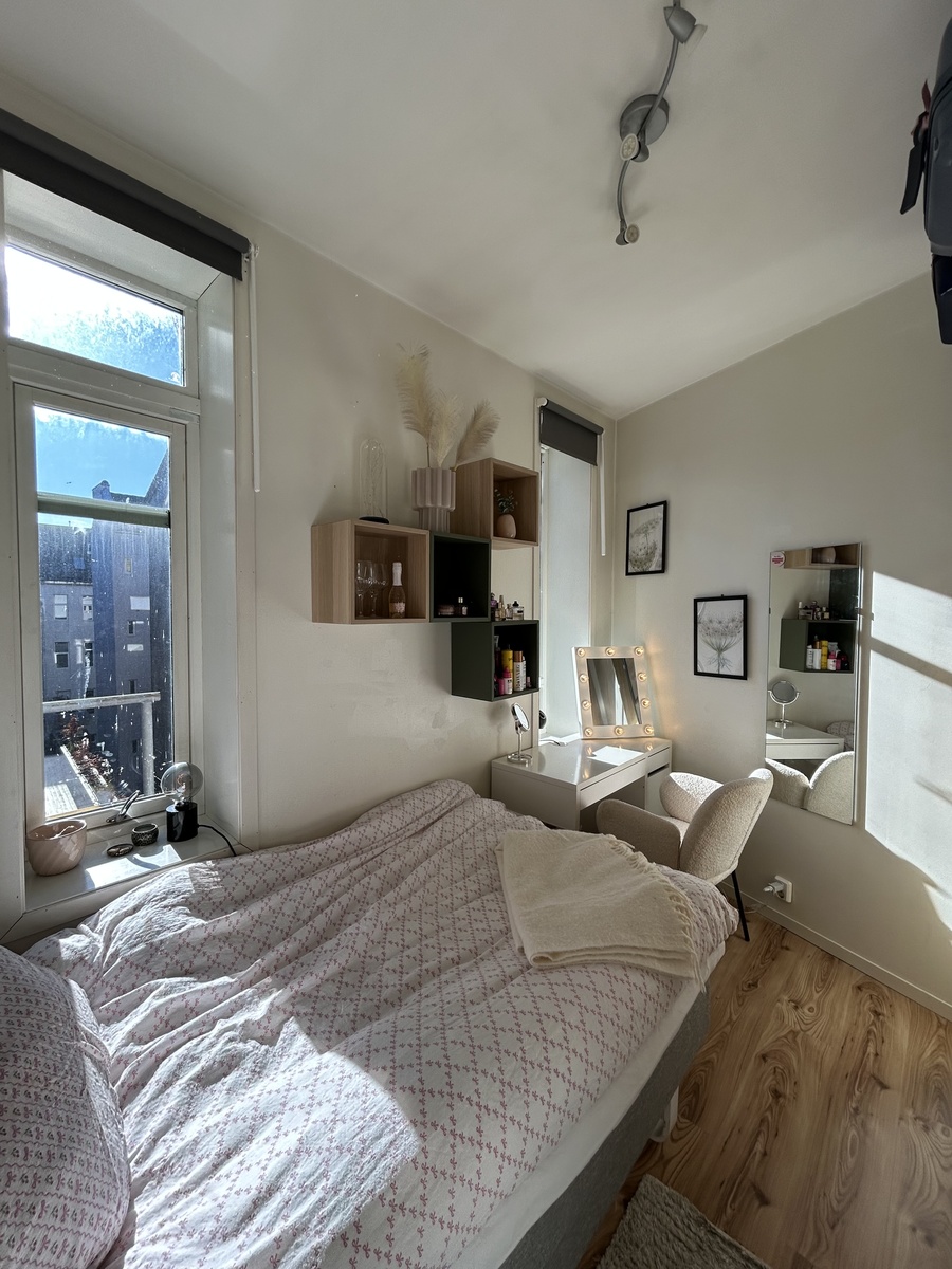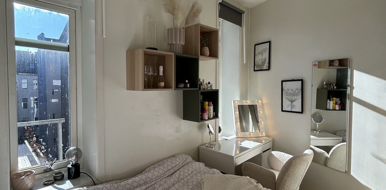 Rommet som leies ligger vendt ut mot en rolig bakgård, får mye naturlig lys fra to vinduer, og kommer møblert med seng, garderobe, kommode og pult.