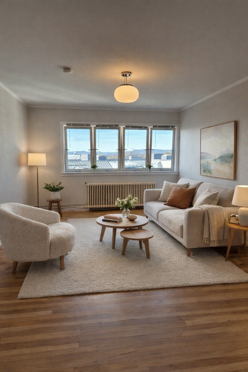 Leiligheten er nå umøblert etter oppussing, men møbler kan skaffes dersom leietaker ønsker det. Møblene på bildene er eksempler på møblering.