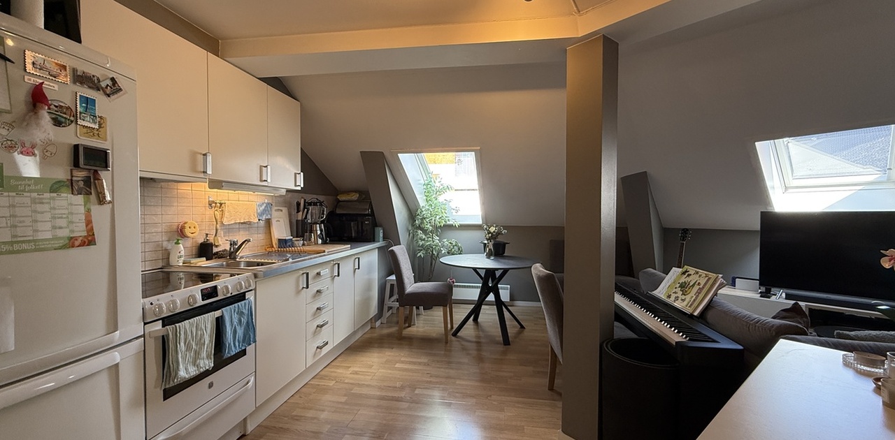 Leiligheten består av stor stue med åpen kjøkkenløsning som inneholder kjøleskap, komfyr og platetopp. 2 romslige soverom og bad.