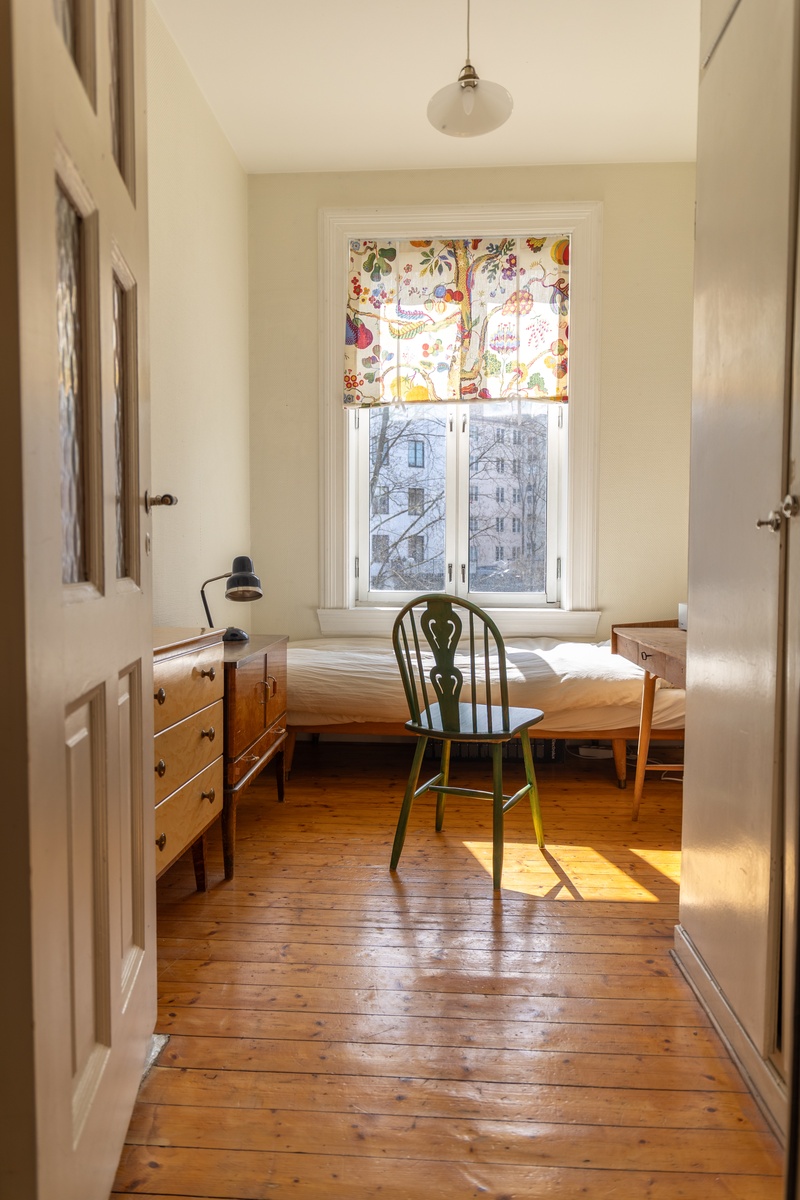 Rommet har originale tregulv, utsikt mot rolig bakgård og gode oppbevaringsmuligheter med innebygd skap.