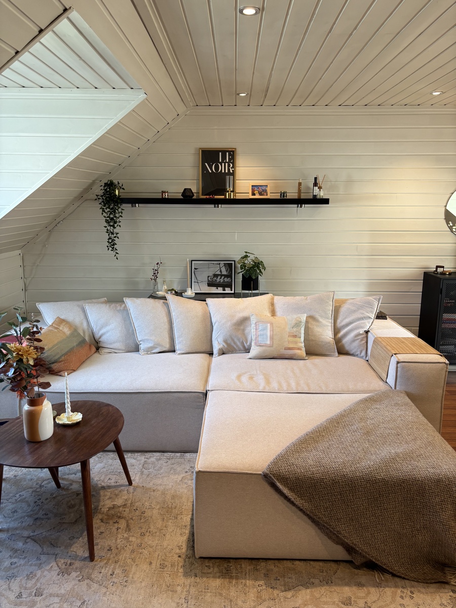 Boligen har ett soverom vendt mot bakgård, og til tross for den sentrale beliggenheten oppleves leiligheten som stille, med godt isolerte vegger og vinduer som demper støy. Skråtakene gir leiligheten særpreg og sjarm, og sammen med gode lysforhold skaper de en lun og hyggelig stemning.