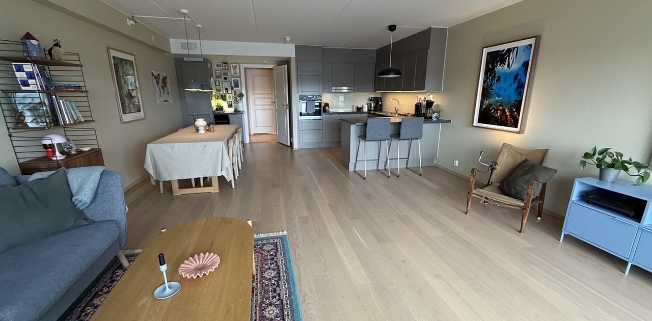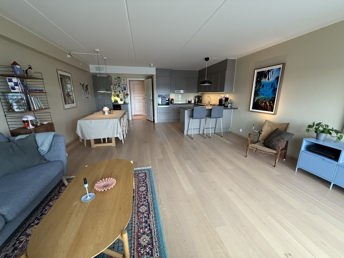 Boligen ligger i 6. etasje, og oppleves som lys og luftig. Vi er lite plaget av støy fra naboer og trafikk. Den er gjennomgående og har to balkonger. Østover er det god, fri utsikt med deilig morgen- og formiddagssol, mens det på vestsiden er sol på sommeren til godt ut på kvelden.