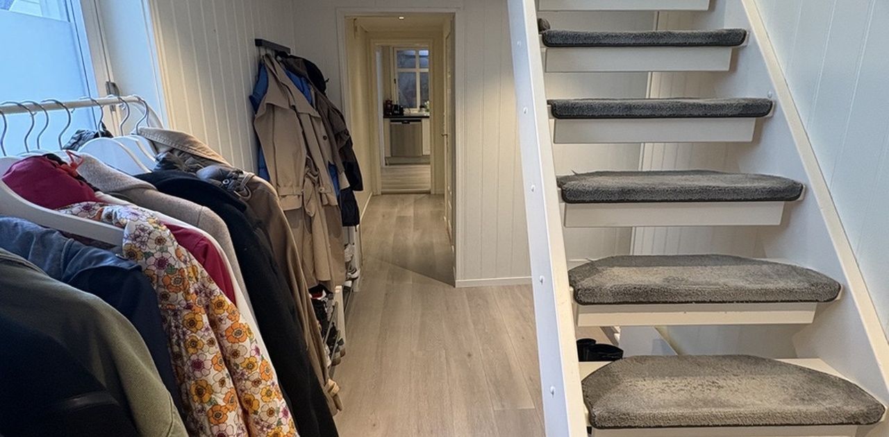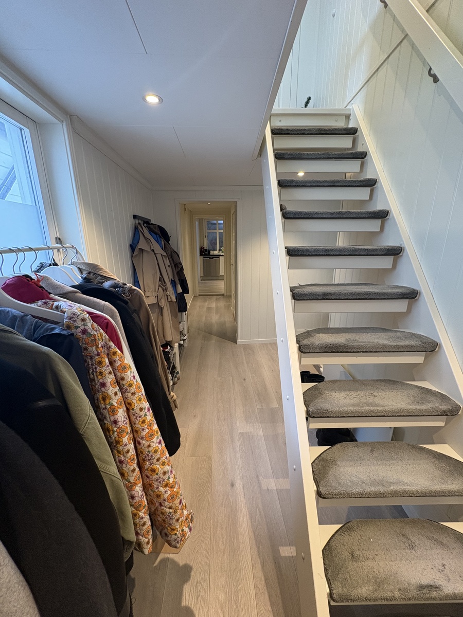 Leilighet streker seg over 2 etasjer. På samme etasje hvor er ledig rom ligger det totalt 2 soverom og et vaskerom. I 1.etg ligger det 1.soverom, bad, kjøkken og stue.