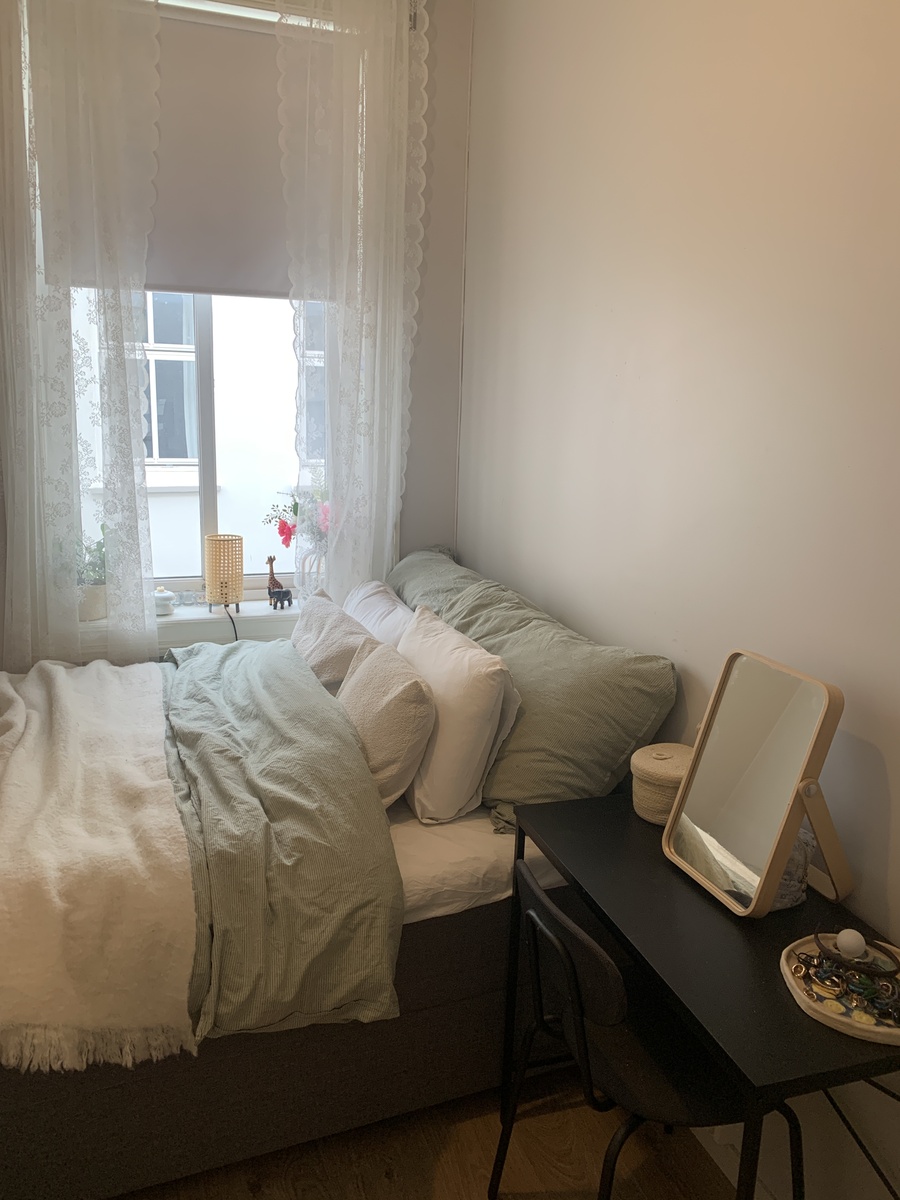 Hei! Vi er tre jenter mellom 23 og 26 år som leter etter en fjerde roomie! Pernille er 23 år, og studerer grunnskolelærer 1-7, Ingrid er 25 år og jobber i klesbutikk, og Mathilde er 26 år og jobber på spesialskole og tar master. Vi er en gjeng som er glad i å inviterer til spillkveld og vors, men liker også å ta en rolig kveld med film og kos i stua. Rommet som leies ut er lite, men ok størrelse. Nå er det møblert med en 140 seng og et skap som er 117 bredt, samt også en skrivepult (dette følger ikke med, bare for å gi en følelse av hva du kan få plass til).