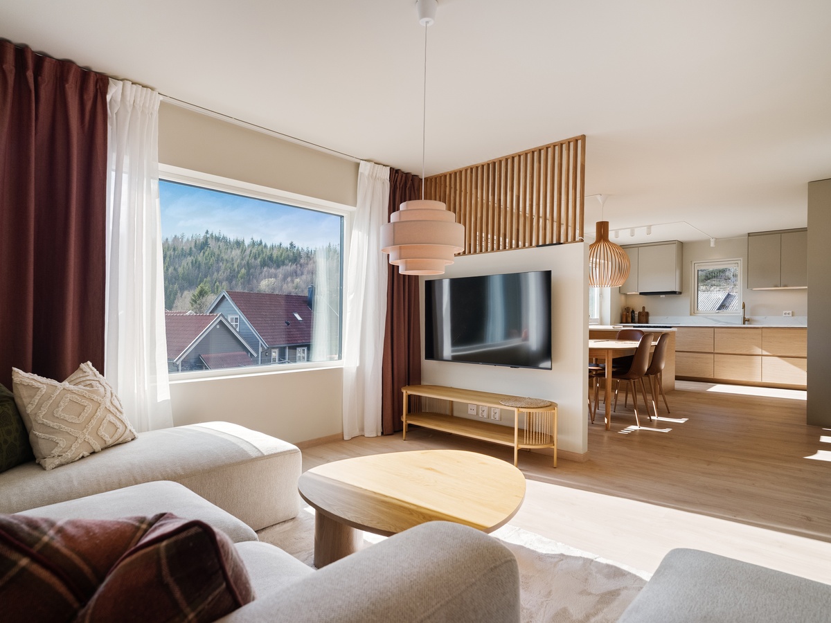 - Store vinduer mot sør, gardiner fra tak til gulv på skinner. Spilevegg i ekte eik og vegghengt ambilight 55" TV skaper en hyggelig atmosfære. Ny sofa med tilhørende puff.