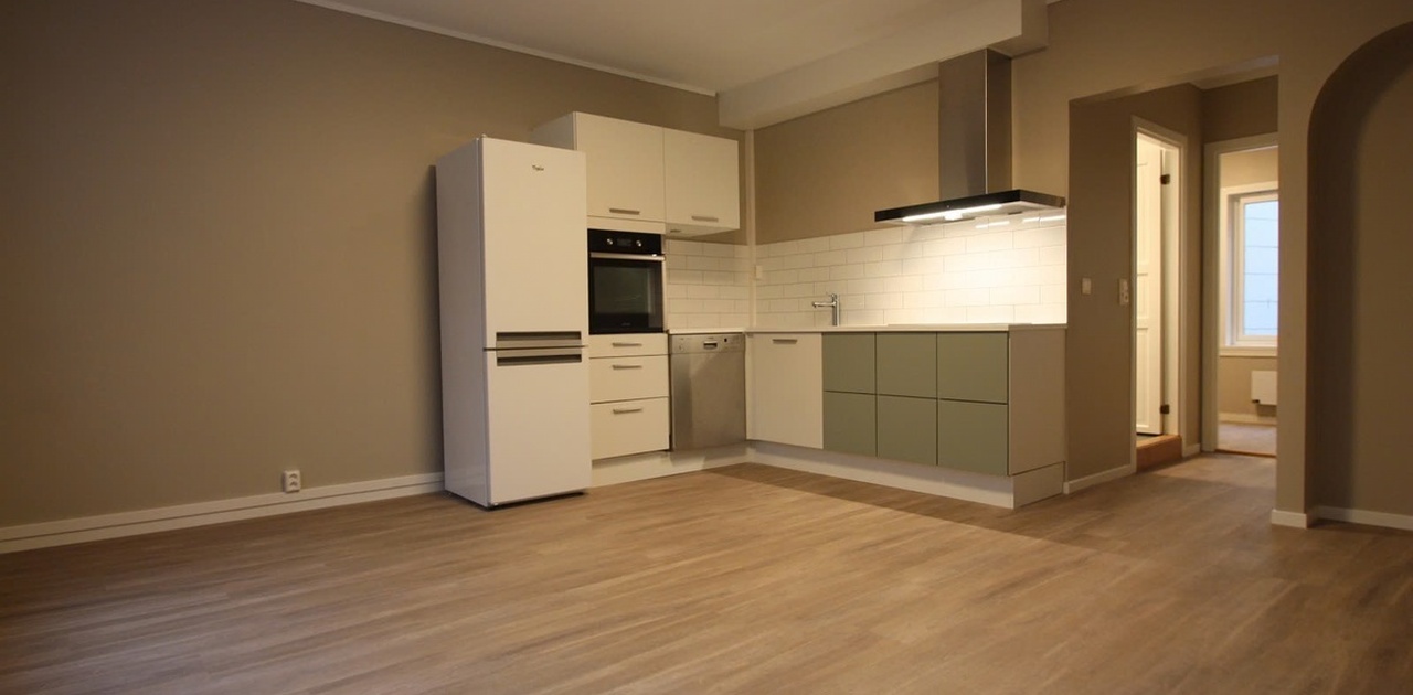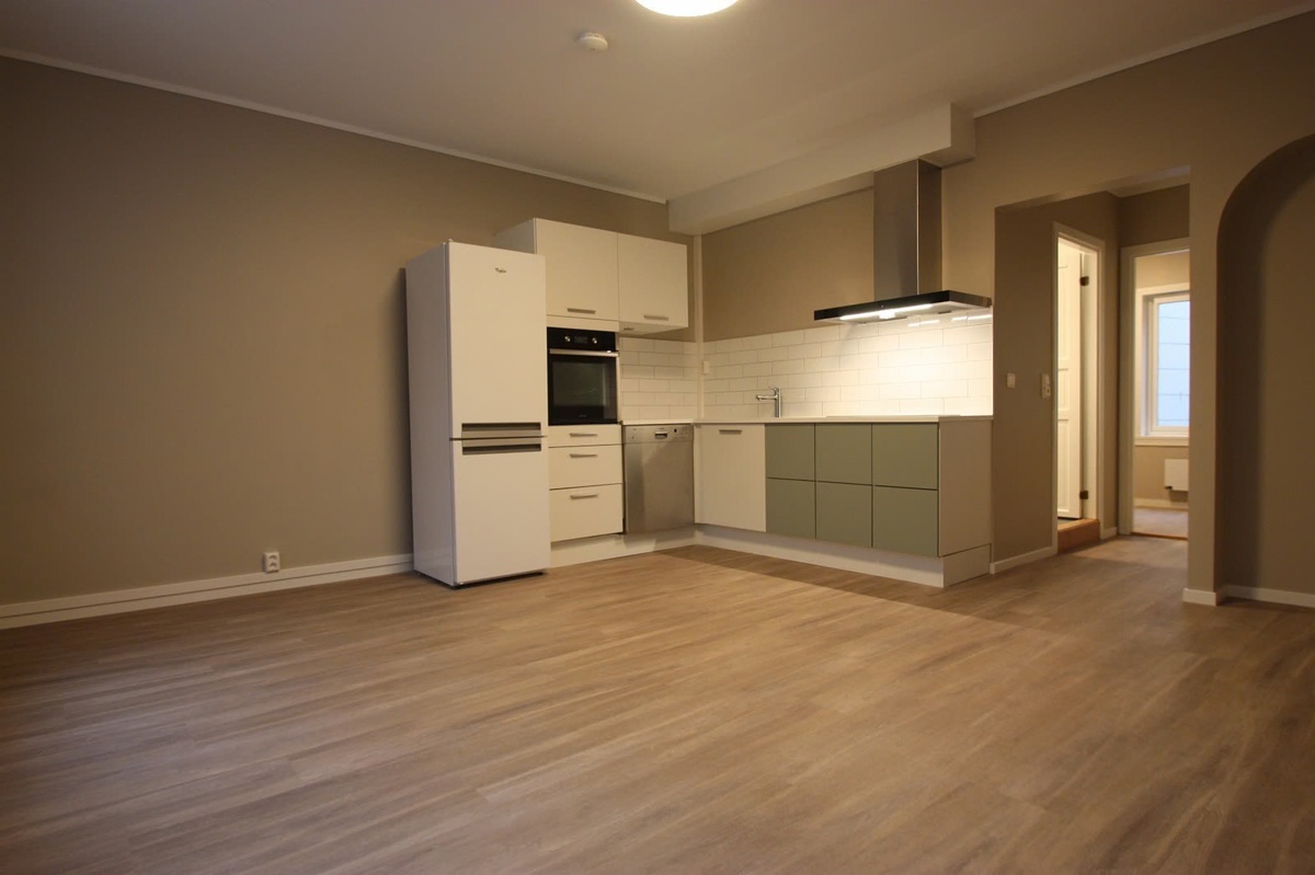 Dette er en stor og flott leilighet, alt nytt i 2019. Den har kjøkken, bad, stue og to store soverom og ett mindre som enten kan brukes som det eller som garderobe. De to store soverommene ligger mot bakgården, mens det minste har vindu mot gaten. Leiligheten er lekker med masse skapplass, glatte fronter på kjøkkenet, flislagt bad med varmekabler. Det er høyt under taket, og alle rom har store vinduer med godt lysinnslipp. Fiber fra Bergen Fiber ligger ferdig installert i leiligheten, leietaker kan tegne eget abonnement til rabatterte priser. Alle hvitevarer følger med.