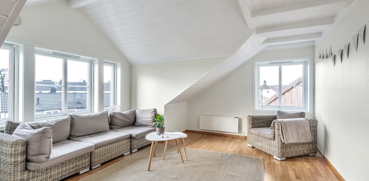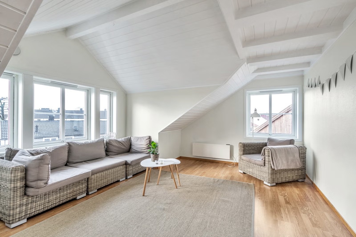 Hyggelig og praktisk loftsleilighet beliggende i byggets 3. etasje. Leiligheten har en god planløsning med to romslige soverom, samt en åpen stue- og kjøkkenløsning som gir en luftig og sosial atmosfære.