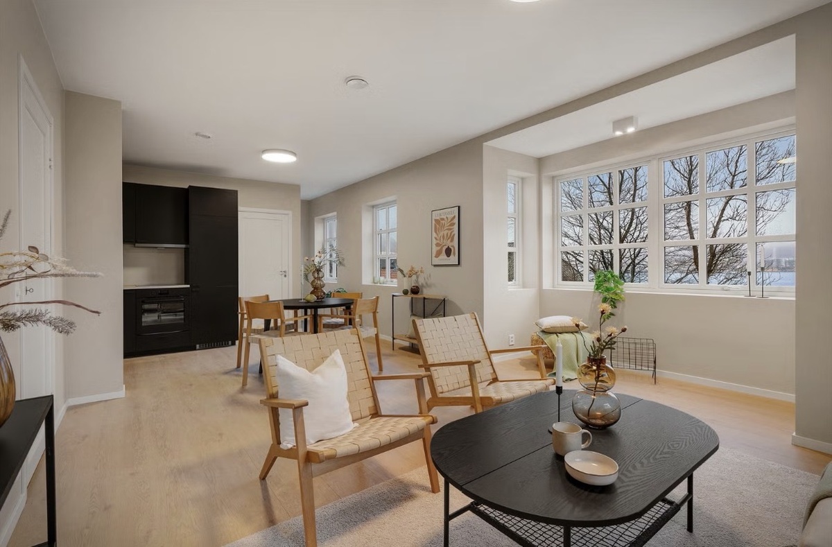 Leiligheten ble totalrenovert i 2025/2026 og holder en gjennomgående moderne standard. Den har en åpen stue/kjøkkenløsning med nydelig sjøutsikt. Bygget har balansert ventilasjon, som gir et godt inneklima. Beliggenheten er sentral, med gode bussforbindelser og kort vei til sentrum. Det er også tilgang til en felles uteplass rett utenfor leiligheten.