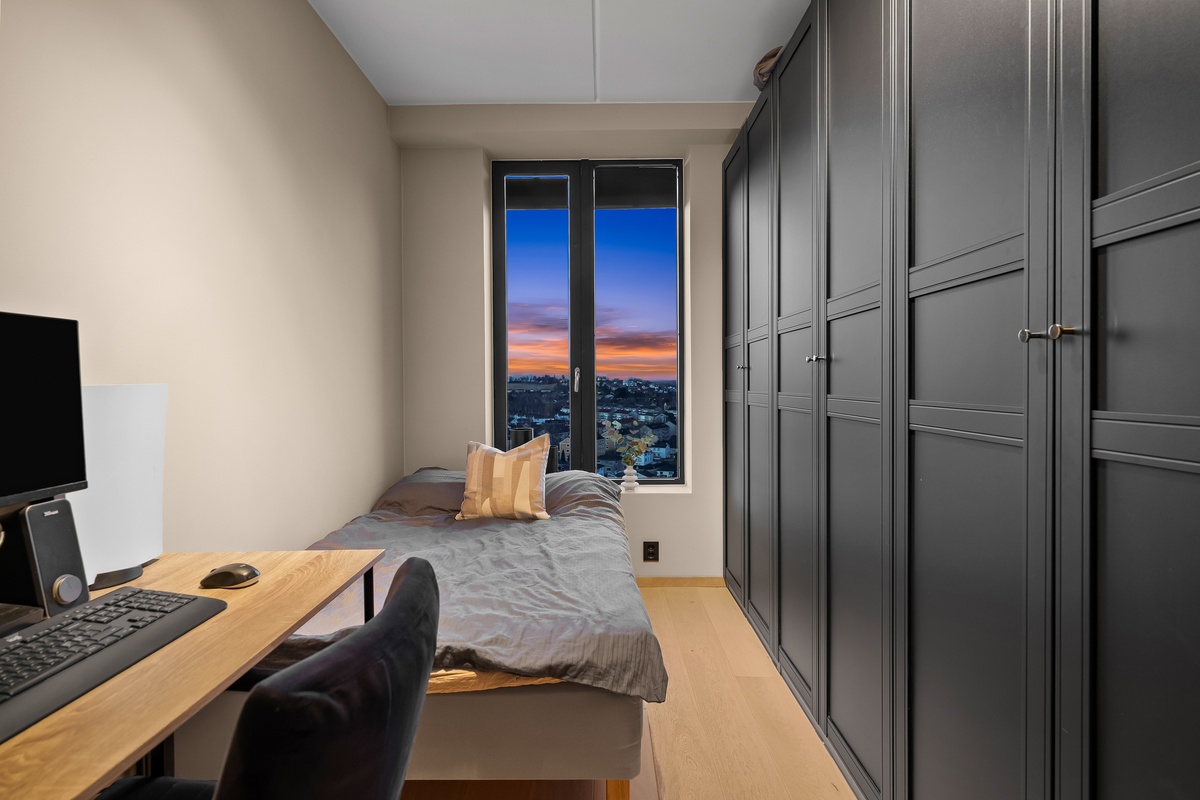 Dette er en svært innbydende og stilren 3‑roms hjørneleilighet beliggende i 14. etasje, med en spektakulær panoramautsikt så langt øyet kan se. Leiligheten har et attraktivt sydvestvendt hjørnelag og byr på utmerkede lysforhold gjennom store panoramavinduer.